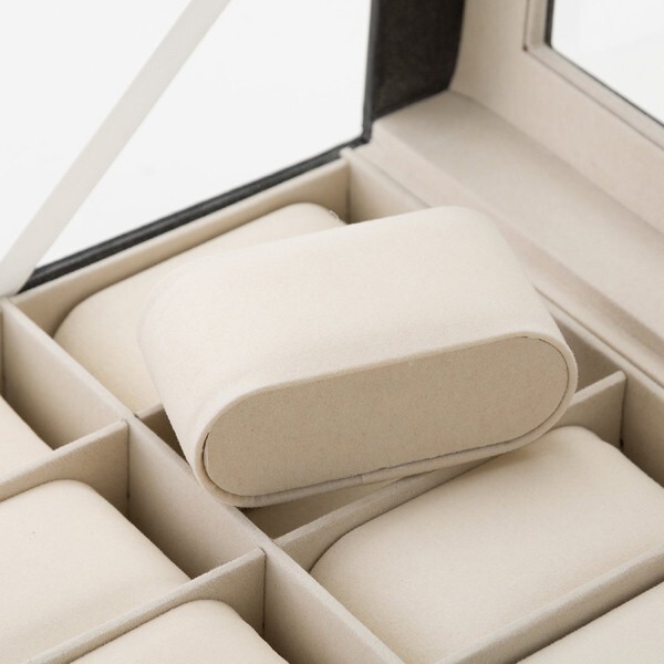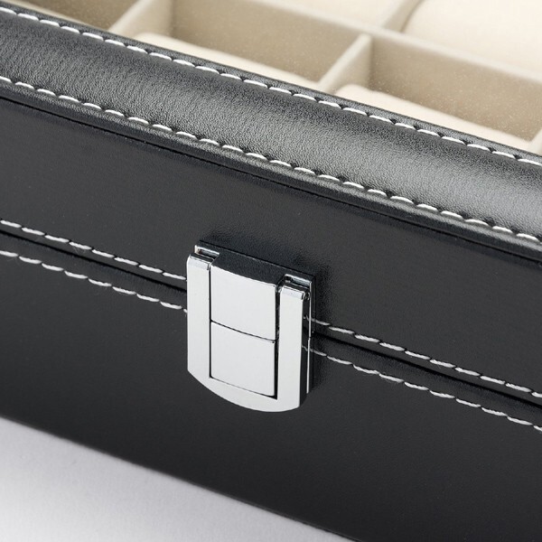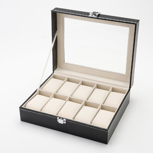 ■腕時計が10本も収納できるコレクションケースです。 ■内部は時計を傷めないようにソフト素材で作られています。 ■インテリアにもマッチするおしゃれなスムース調のデザインです。 ■時計好きな方への贈り物としても人気があります。 サイズ・特徴 素材:合成皮革・アクリル・他 サイズ(約):横幅28cm×奥行20cm×高さ8.5cm