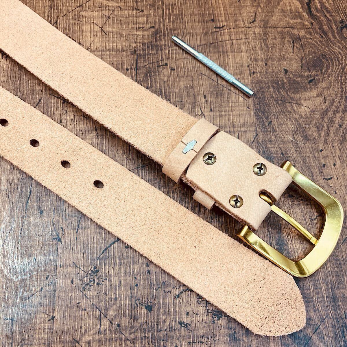 本革の醍醐味であるエイジングが存分に楽しめるナチュラルヌメ革を使用したレザーベルトです。使えば使うほどに味が出てきます。しっかりとした厚みで作られた重厚なゴールド色のバックルが高級感を与えます。