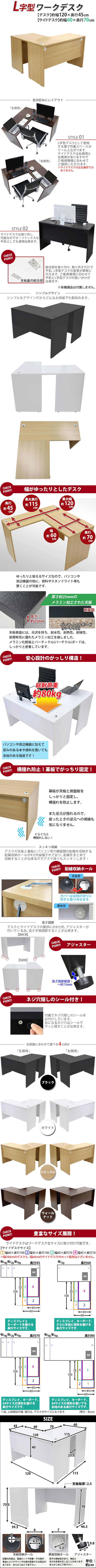 | 商品紹介 | ■作業スペースを広く確保出来る、L字型ワークデスクです。 ■サイドデスクの幅が約60cmのタイプです。 ■会議室や事務所等、オフィス家具として様々なシーンでお使いいただけます。 ■天板には、メラミン加工を施しています。 ■幕板が天板と側面板をがっちりと固定!横揺れを防止します。 ■ネジ穴隠しのシール付き。 ■デスクの天板と幕板に配線収納ホールが2カ所ずつ備わっています。 ■アジャスターで高さの調節が可能です。(高さ調節範囲〜約15mm) ※こちらの商品は、組立て式です。組立てにはプラスドライバーが必要です。お客様でご用意ください。 ※組立図が付属します。 ※サイドデスクの取り付けはデスクの右側専用となります。 ■材質:パーティクル(パーチクル)ボード(メラミン加工)(本体、サイドデスク)、プラスチック(アジャスター、配線収納ホール) ■重量:約39kg(デスク:約23kg、サイドデスク:約16kg) ■総耐荷重:約80kg ●新品商品ではありますが、輸入商品の為、多少の擦り傷などがある場合がございますので、ご納得の上ご購入下さいませ。 ●ご購入後、お客様ご都合によるご返品、ご返金等は一切お受け致しておりません。 ●本商品を使用した際に発生したトラブル、事故につきまして、当社は一切の責任を負いません。ご使用に関しましては、全て自己責任にてお願い致します。 ※カラーはナチュラルとなります。 |