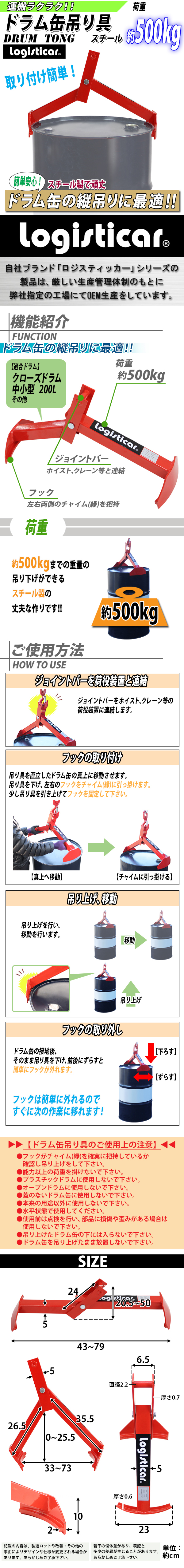 | 商品紹介 | ●簡単に取り付け、ドラム缶の縦吊りに最適!! ●ドラム缶のチャイム(縁)を把持し、クレーン・ホイスト等の荷役装置に連結して、吊り上げを行います。 ■荷重:約500kg ■適合機種:クローズドラム、中小型、200L、その他ドラム缶 ※プラスチックドラムには使用できません。 ■本体重量:約6.1kg ■材質:【本体】スチール(炭素鋼) ※こちらの商品は組立て式になります。工具は必要ありません。 ※ドラム缶は商品には含まれておりません。 ※法人・事業所の方は、お届け先又は備考欄に必ず法人・事業所名をご記入ください!!! ★ご購入前の注意事項★ ★1階車上でのお渡しとなります。恐れ入りますが荷降ろし・搬入は、お客様にてお願い致します。 ●新品商品ではありますが、輸入商品の為、多少の擦り傷などがある場合がございますので、ご納得の上ご購入下さいませ。 ●ご購入後、お客様ご都合によるご返品、ご返金等は一切お受け致しておりません。 ●本商品を使用した際に発生したトラブル、事故につきまして、当社は一切の責任を負いません。ご使用に関しましては、全て自己責任にてお願い致します。 |