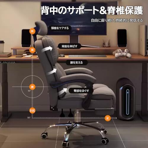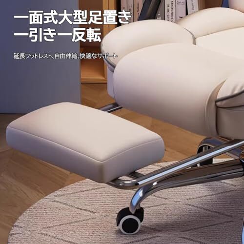 【リラックスを極めるフットレスト付き】:座面下に組み込まれた引き出し式フットレストは、リクライニングと組み合わせれば脚をしっかり伸ばしてくつろげるリクライニングチェア同等の快適さを提供します。ゲームでの休憩、映画鑑賞、短い仮眠など、多用途に使えるため「ただの椅子」以上の価値を発揮。PCゲーミングチェアとしてはもちろん、家の中のデスクチェアやオフィスチェアの代替としても役立つ万能タイプです