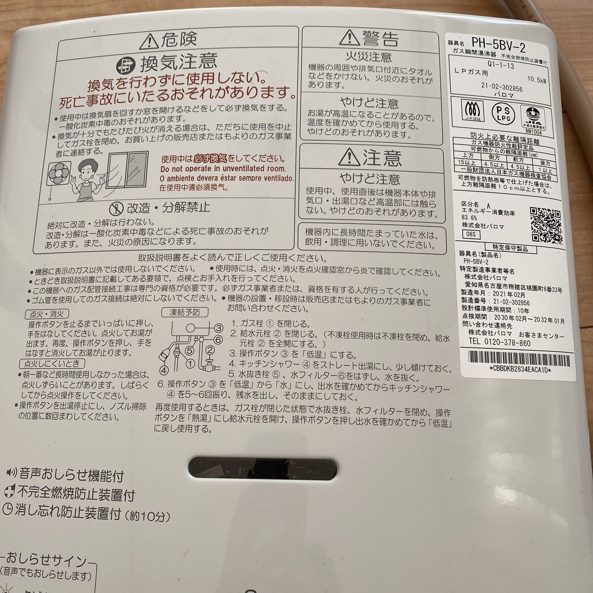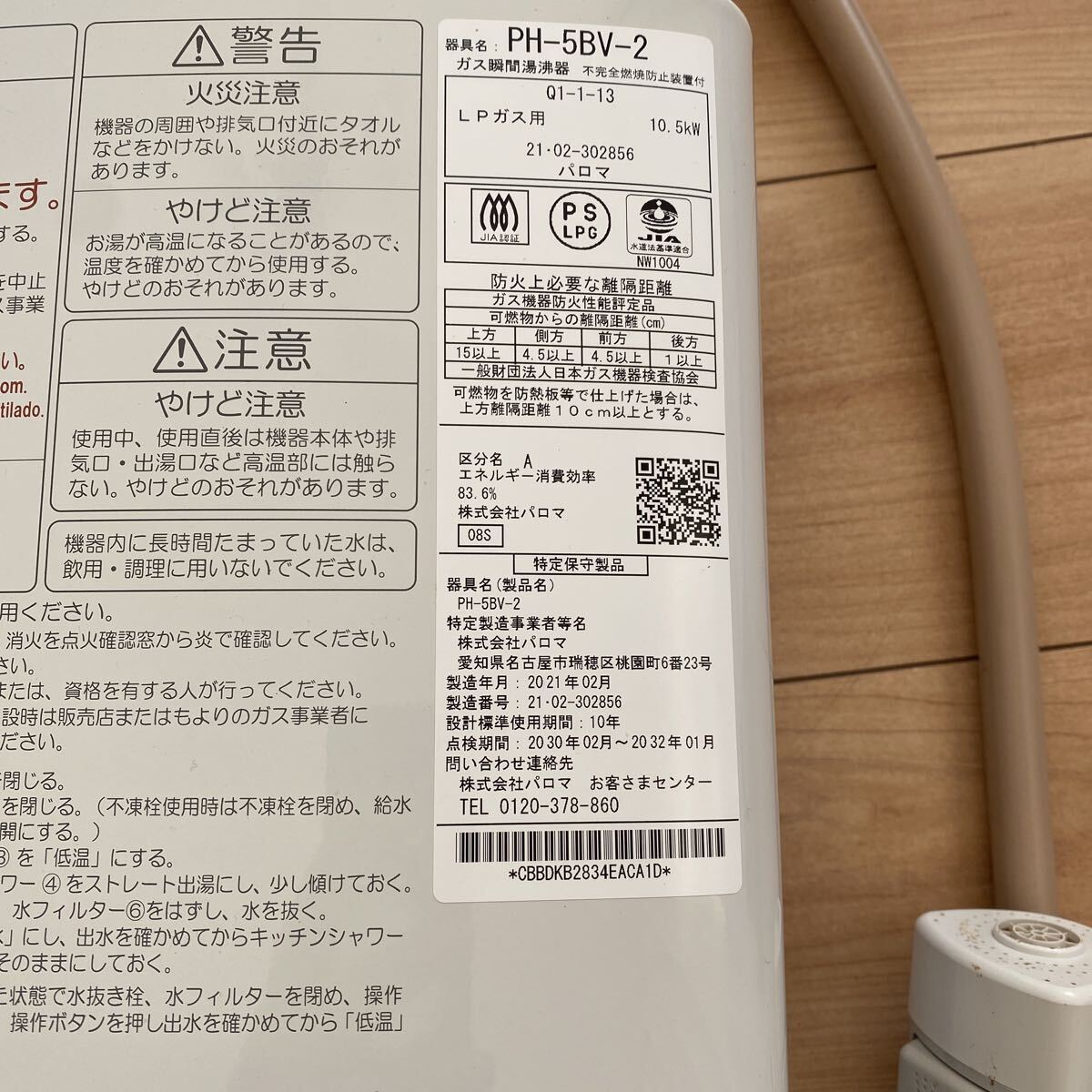 パロマ ガス瞬間湯沸器 LPガス用 PH-5BV-2 21年製