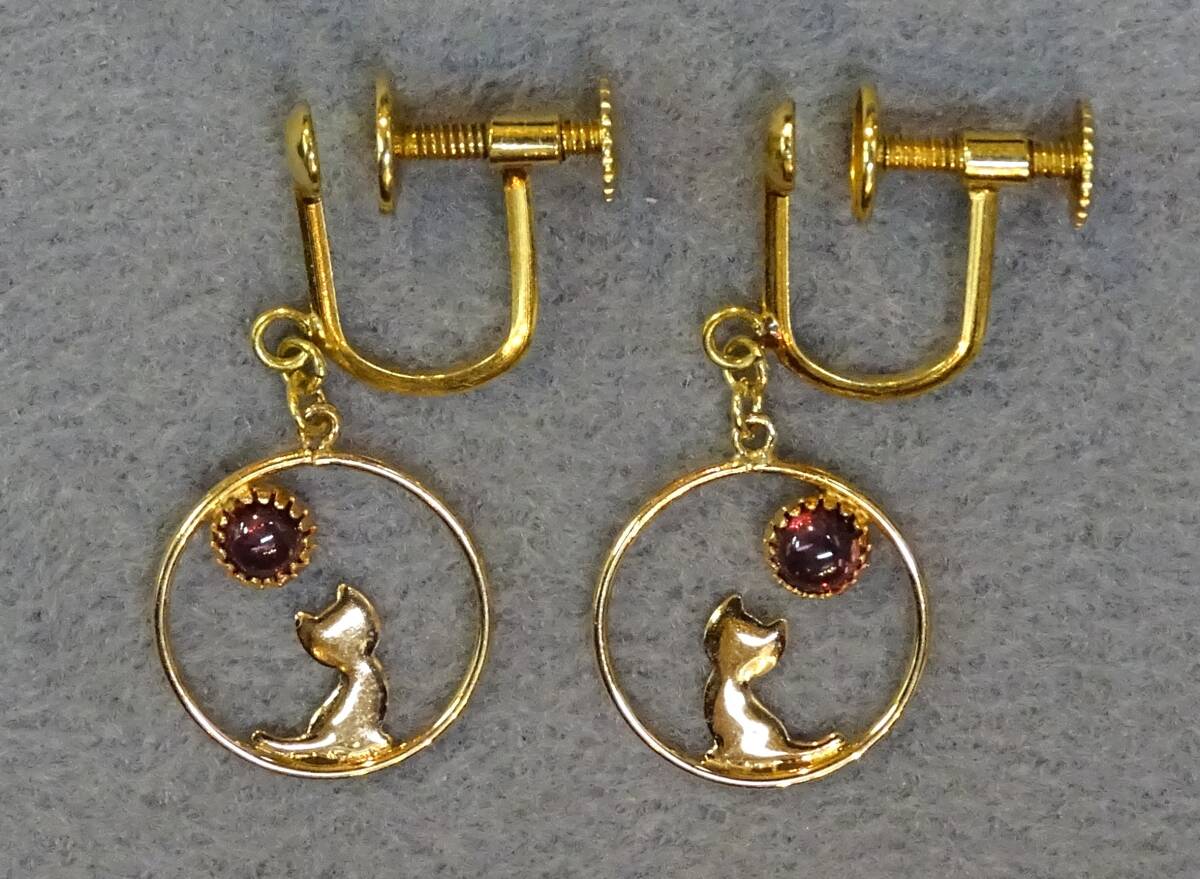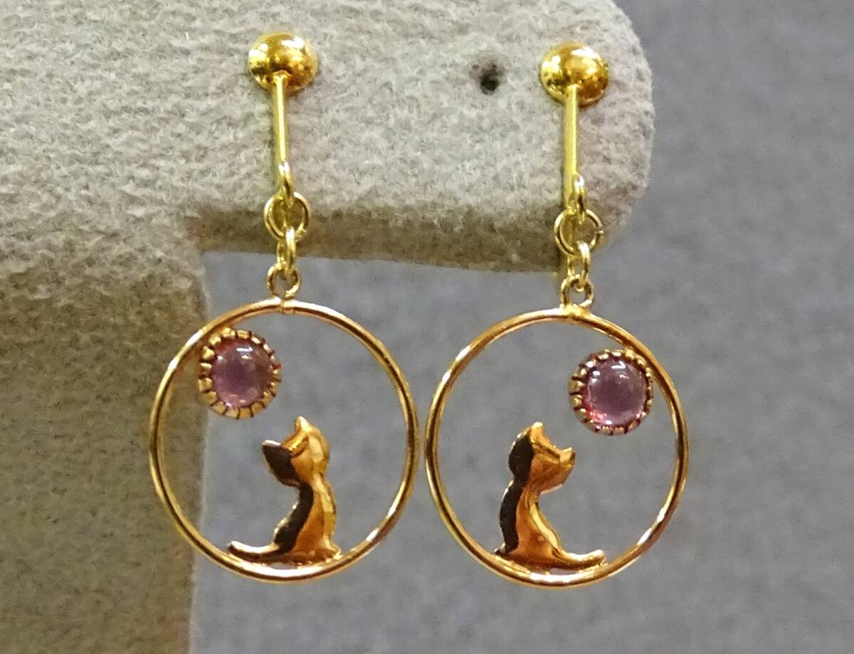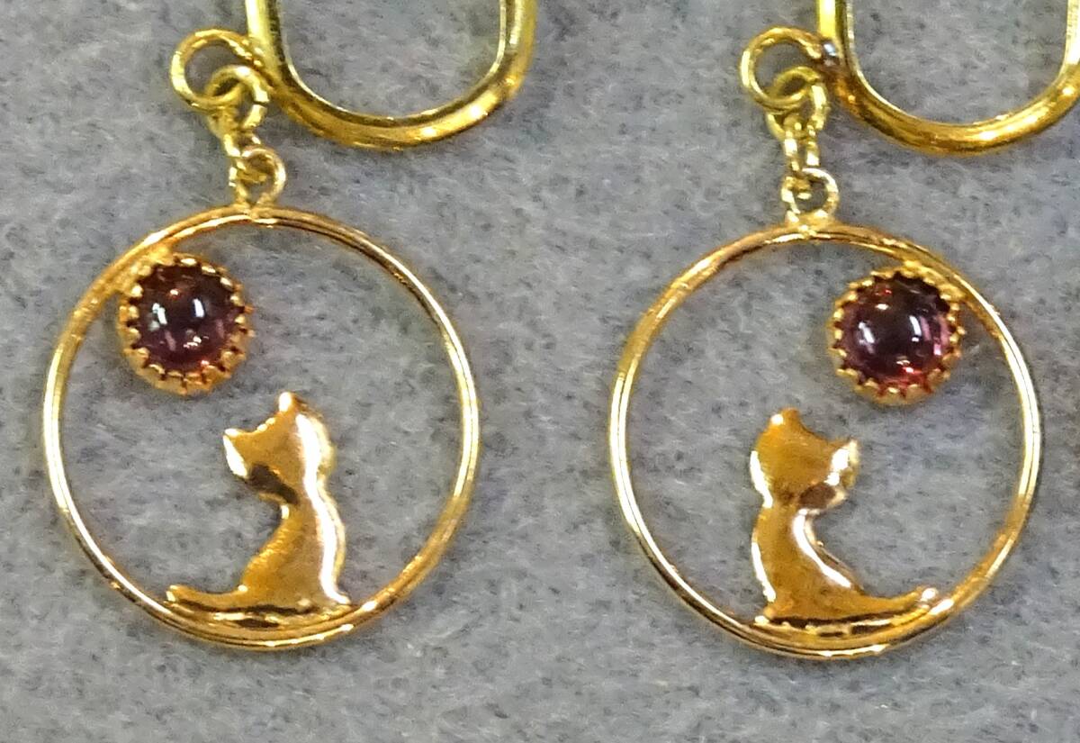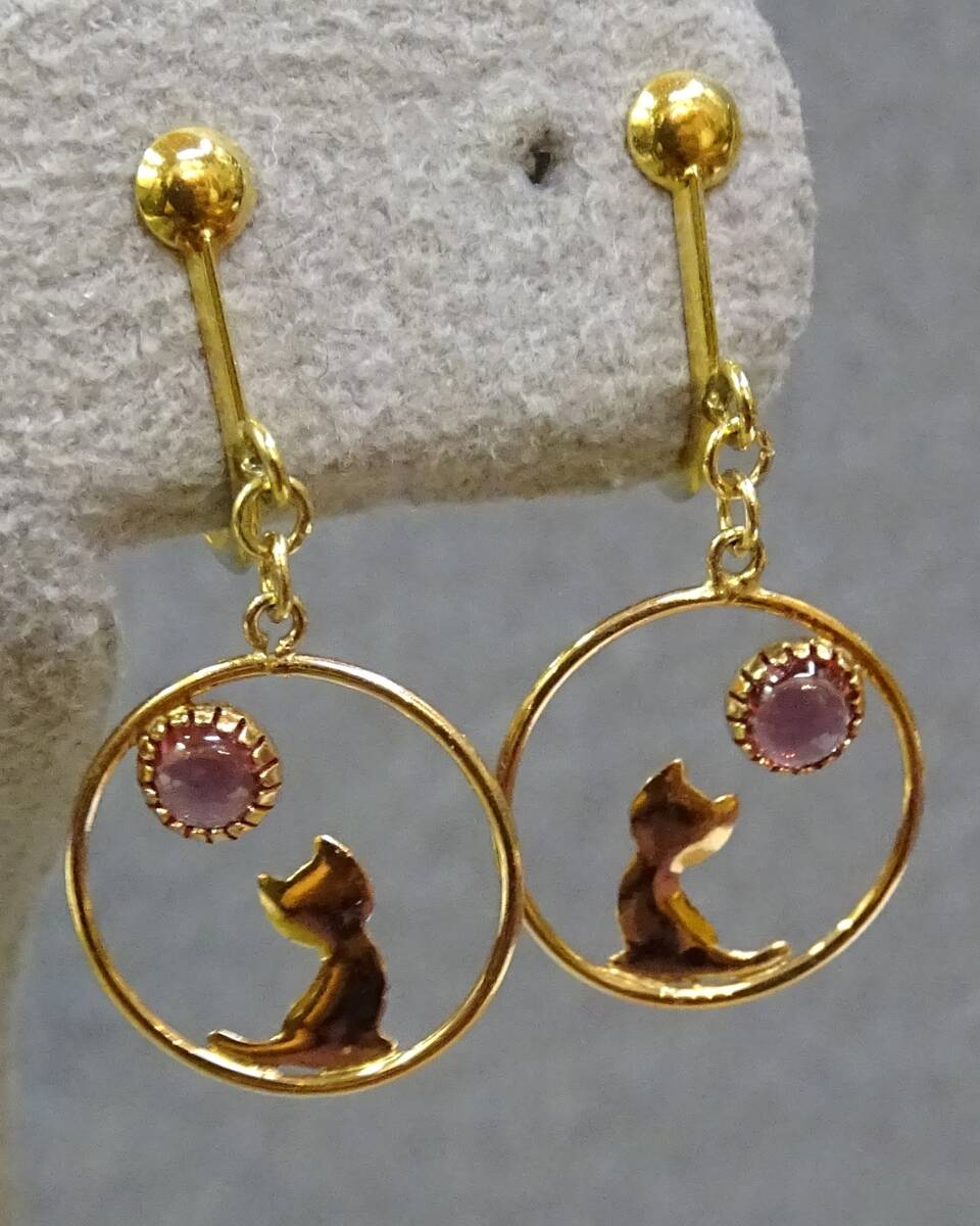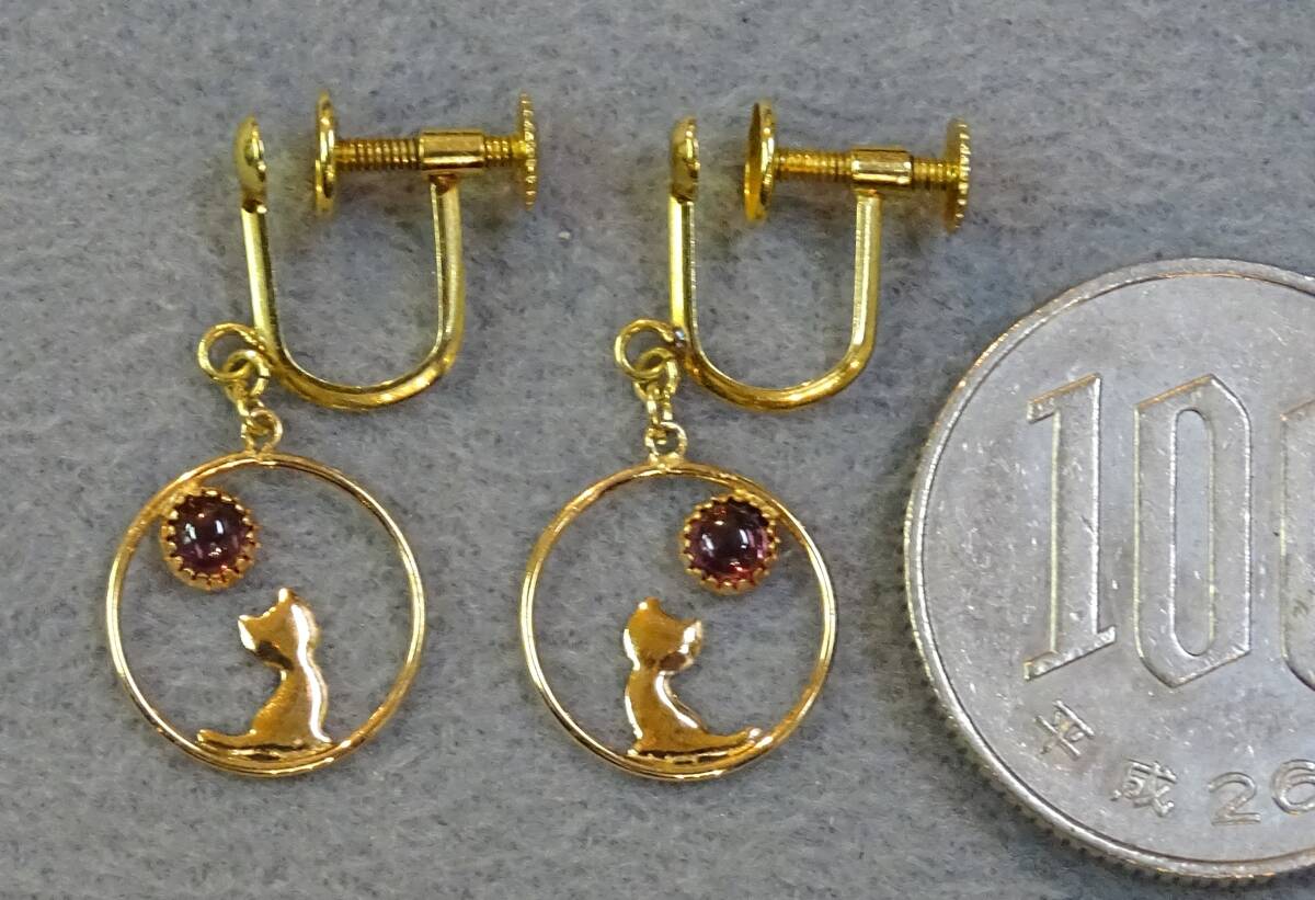 ♪希少・レア・貴重!【ネコ・猫ちゃん】 【K18製】【天然ロードライト・ガーネット】入り【イヤリング】(ねじ止め式金具)!!