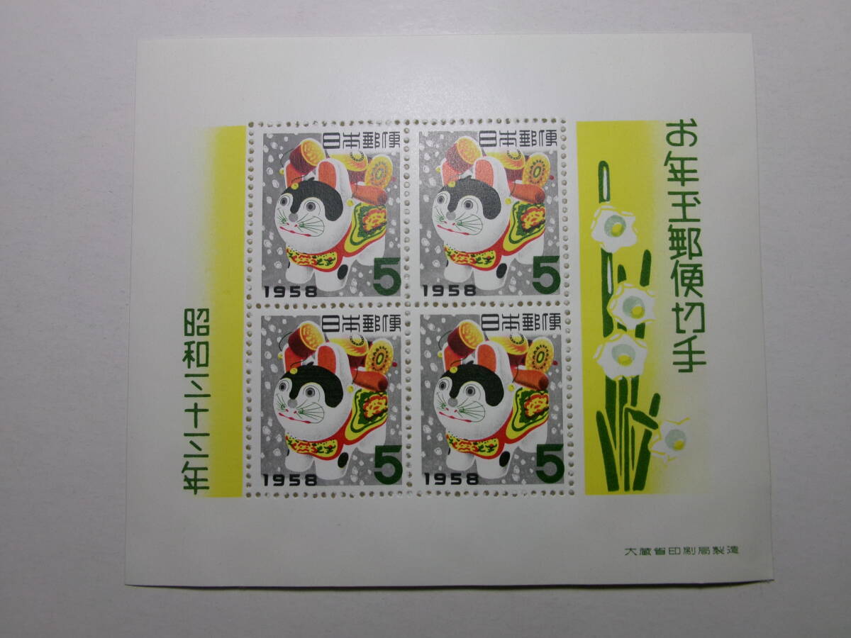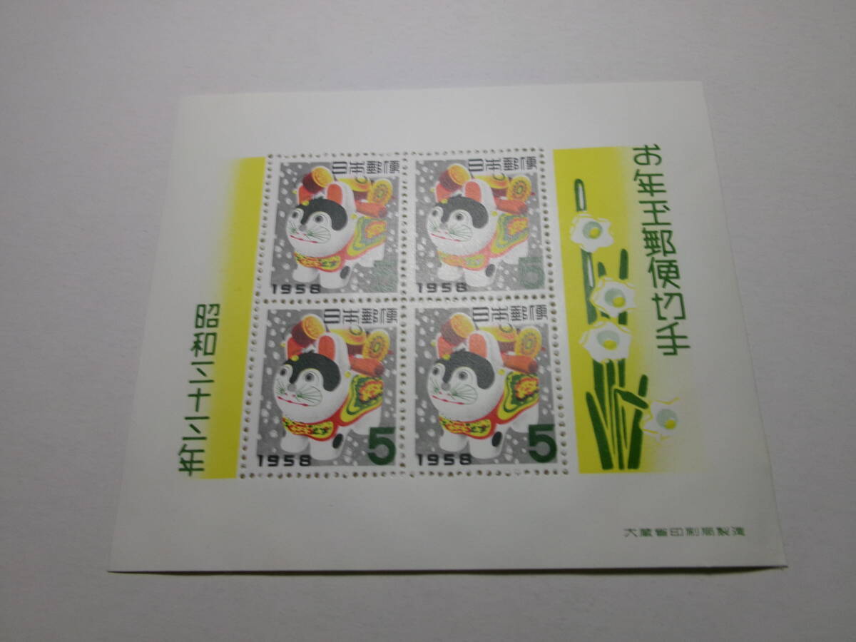 1958年(昭和33年用)年賀切手 犬張子 小型シート 付着物 綺麗 未使用 緑-S
