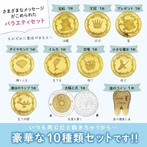 【幸運へ導く金貨も入ったバラエティセット】同じコインをあげ続けると感動がどうしても薄れるもの。歯の形の金貨、トゥースフェアリーの金貨、幸運に導く太陽と月の金貨もセットされています。