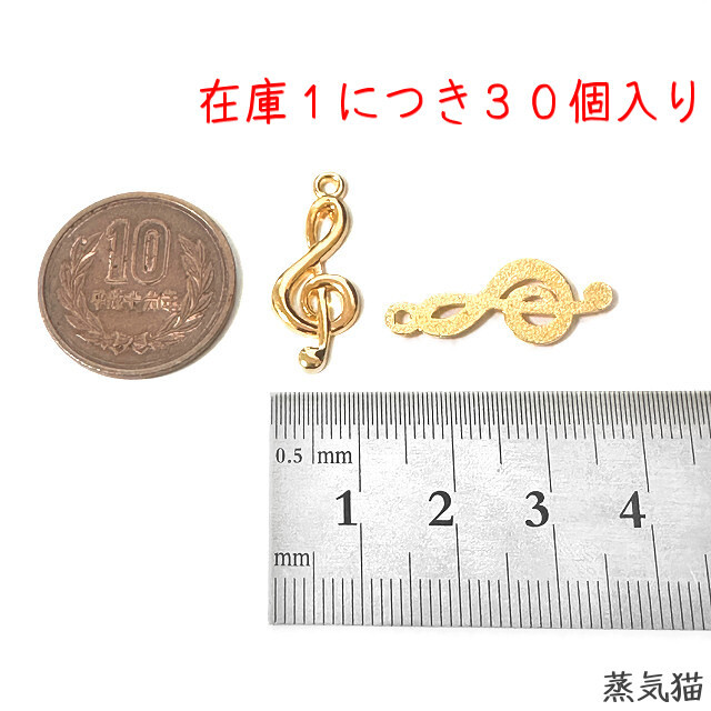 仕様: 1点=30個入り、ゴールド、音符デザイン、メタルチャーム約26mm x 10mm、裏面なし
