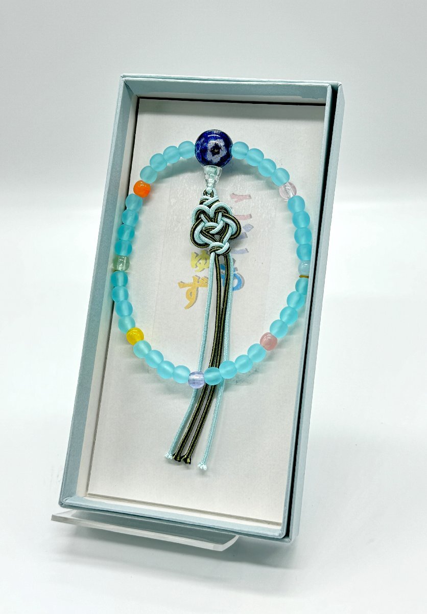 【三枝堂】新品 子供用数珠 「笑顔結び アクア」 外箱入り 人絹房 ガラス製 ☆送料は当社負担☆