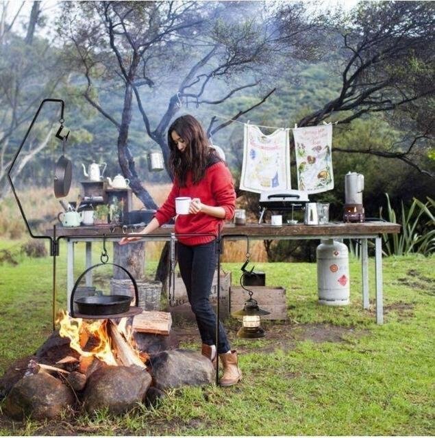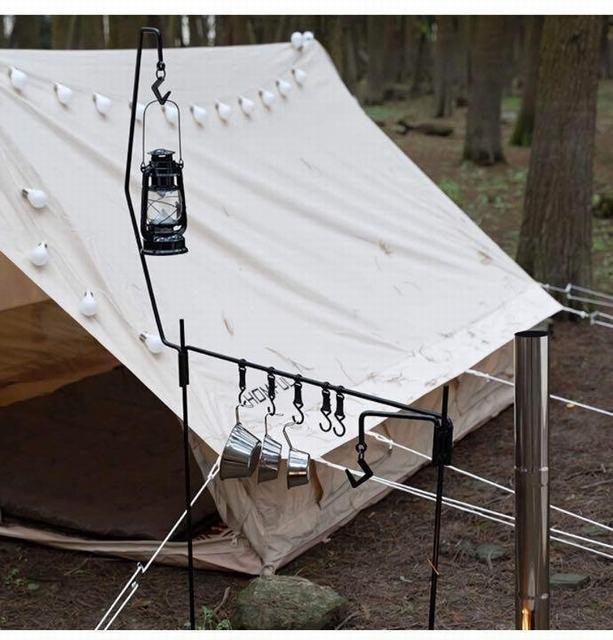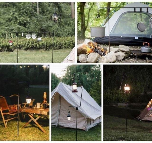 【高い位置と低い位置で照らせるランタン】照明ランタンを高い位置と低い位置で設置でき、キャンプサイト全体を明るく、ピンポイントに必要な場所を照らせます。低い位置のハンガーでは鍋などを吊るして料理などにも大活躍。