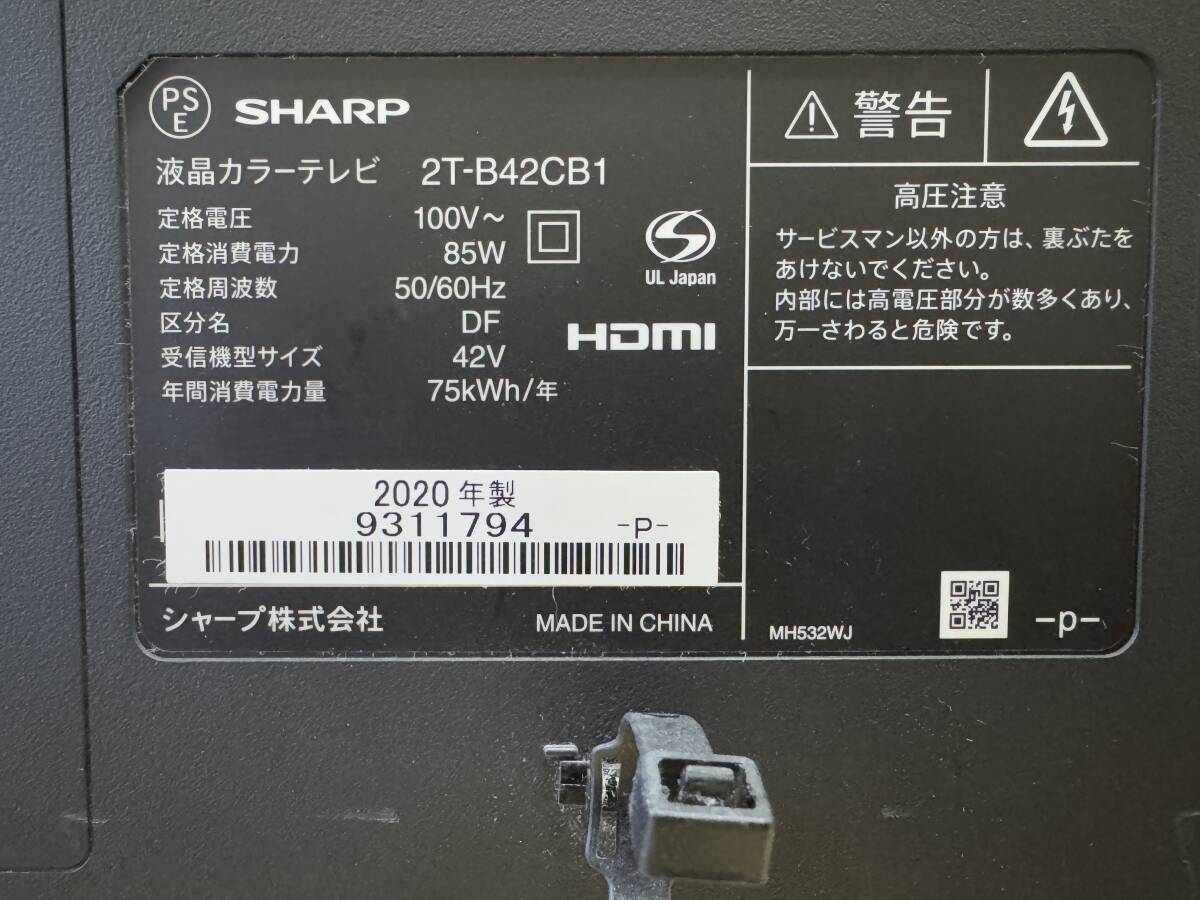 2020年製 シャープ AQUOS 42 LED 液晶テレビ 2T-B42CB1 AQUOS City接続可 ネット動画 u-next DMM 視聴可能 管理番号F1886