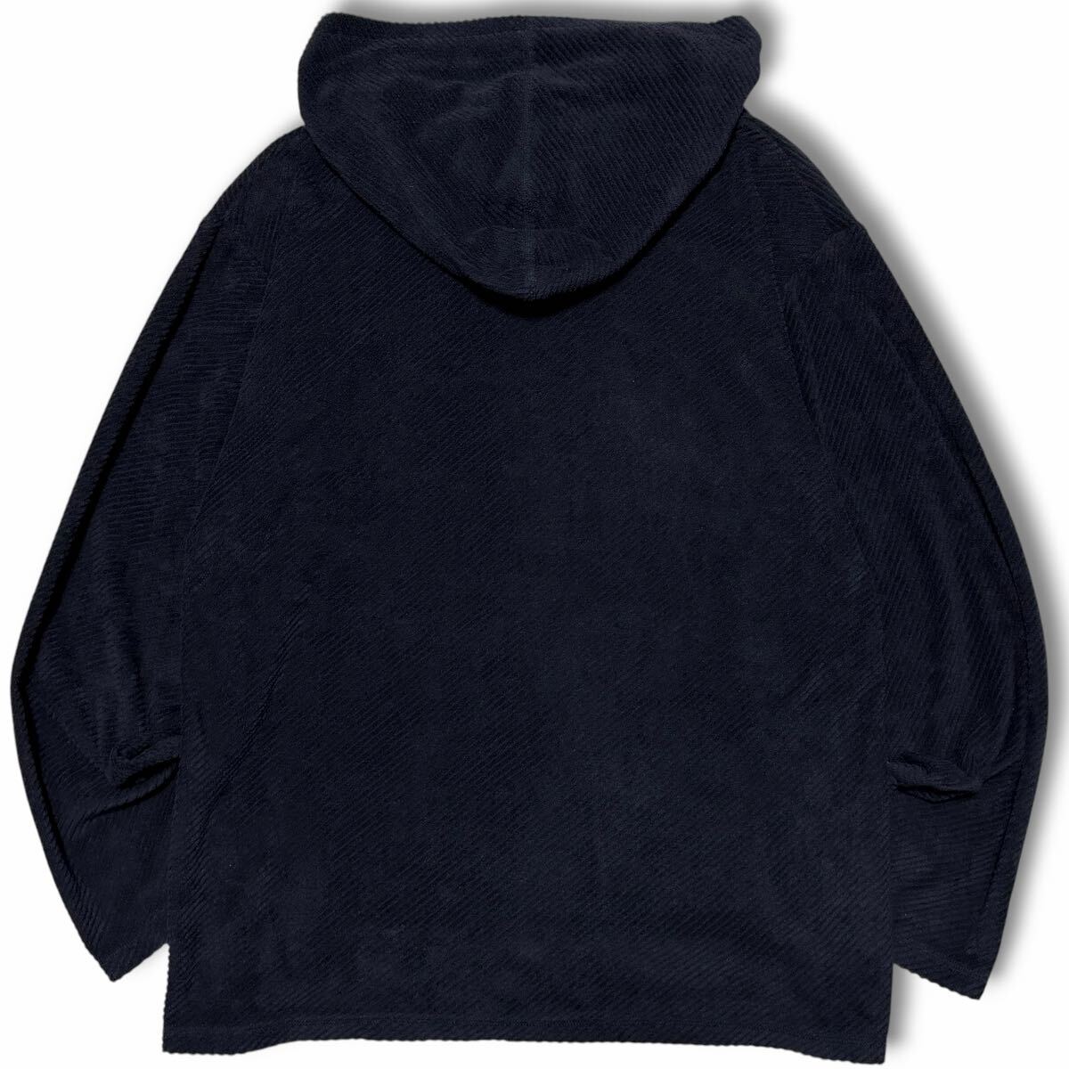 色味は、浜辺の景色にしっとりと馴染む大人のネイビー。暗すぎず、ほんのりと抜け感を漂わせる深いトーンが、自然光の下でより一層雰囲気を引き立てます。リラックス感のあるプルオーバータイプにカンガルーポケットを備え、程よいラフさがありながらもどこか上品な佇まいに。