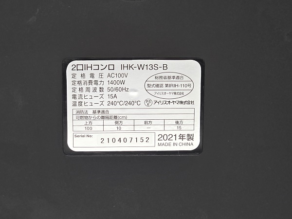 【中古品】 アイリスオーヤマ IRIS OHYAMA 2口 IHコンロ 脚付 IHK-W13S-B 2021年製 ○YR-18609○ の出品です。