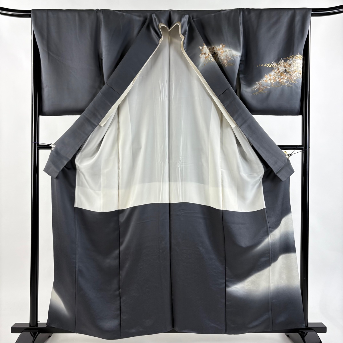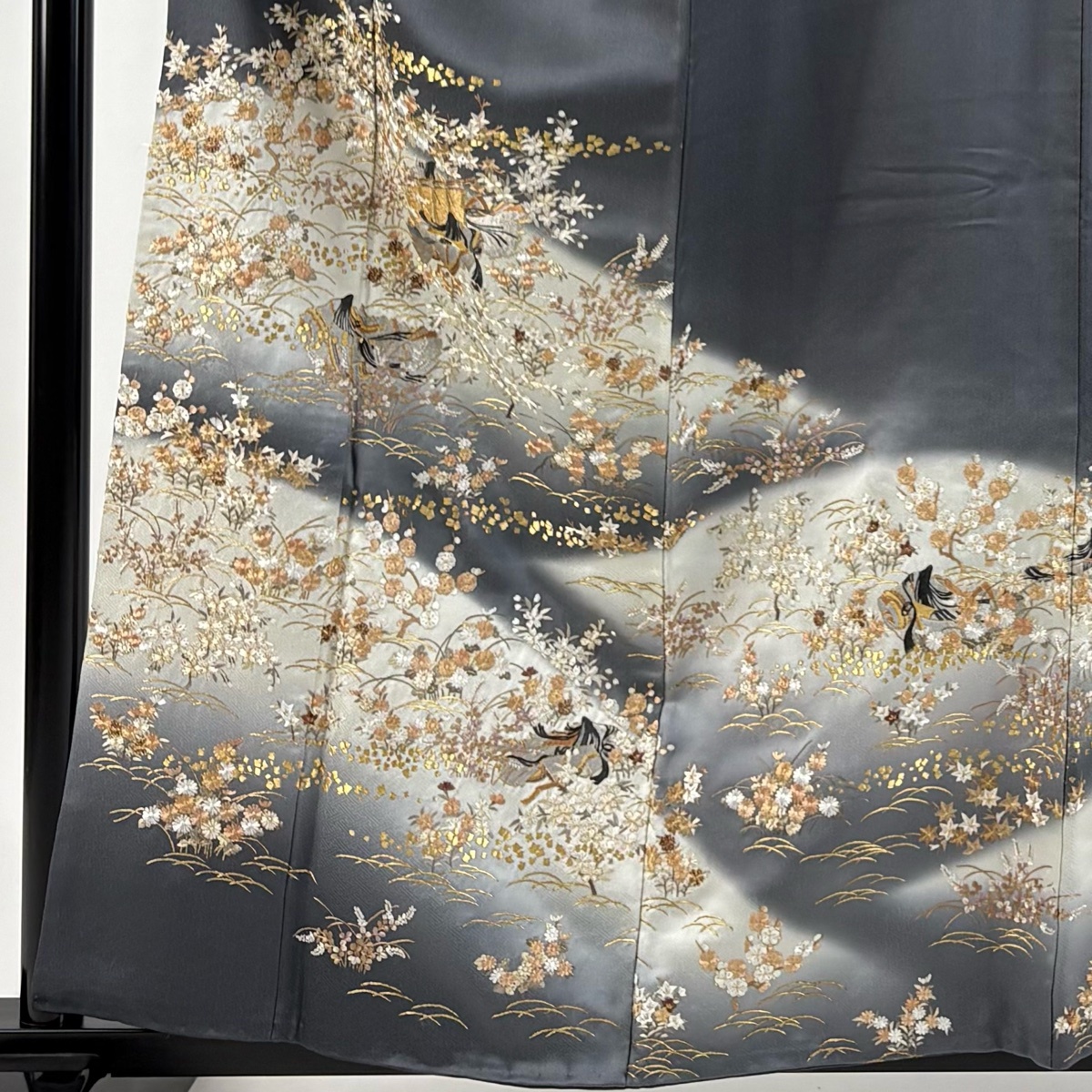 | 訪問着 秀品 人物 枝花 刺繍 金糸 灰色 袷 身丈160 裄丈66.5 M 正絹 【中古】 |