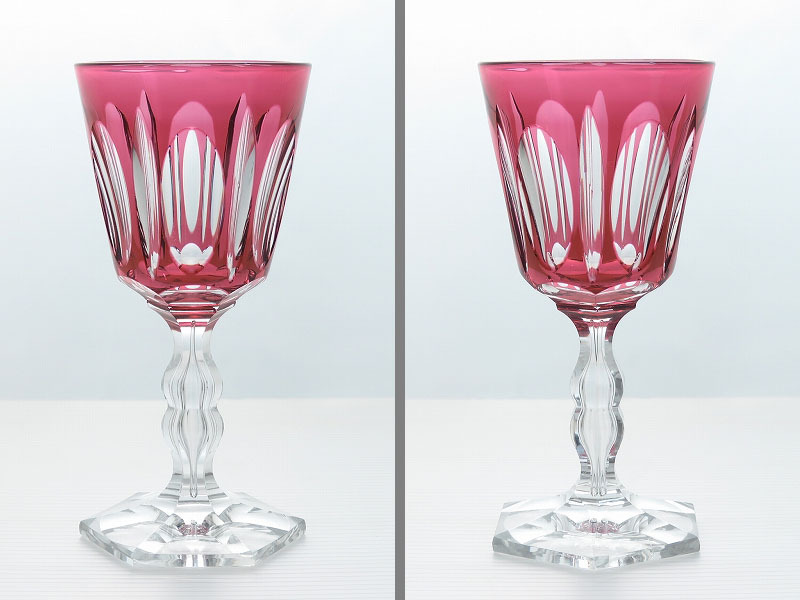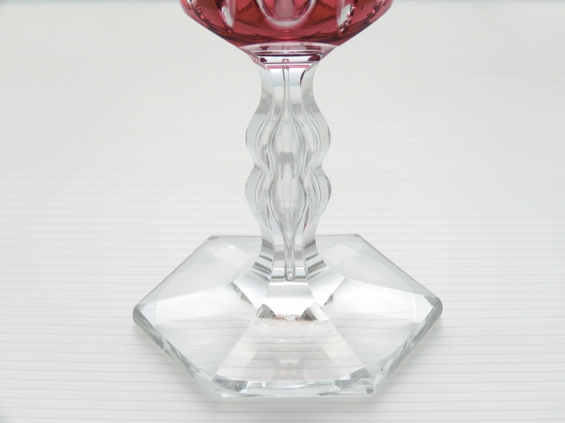 フランスで買い付けた赤いクリスタルガラスの古いリキュールグラスです。六角形の台座と美しいカットのステムが魅力的な脚付きのグラスです。