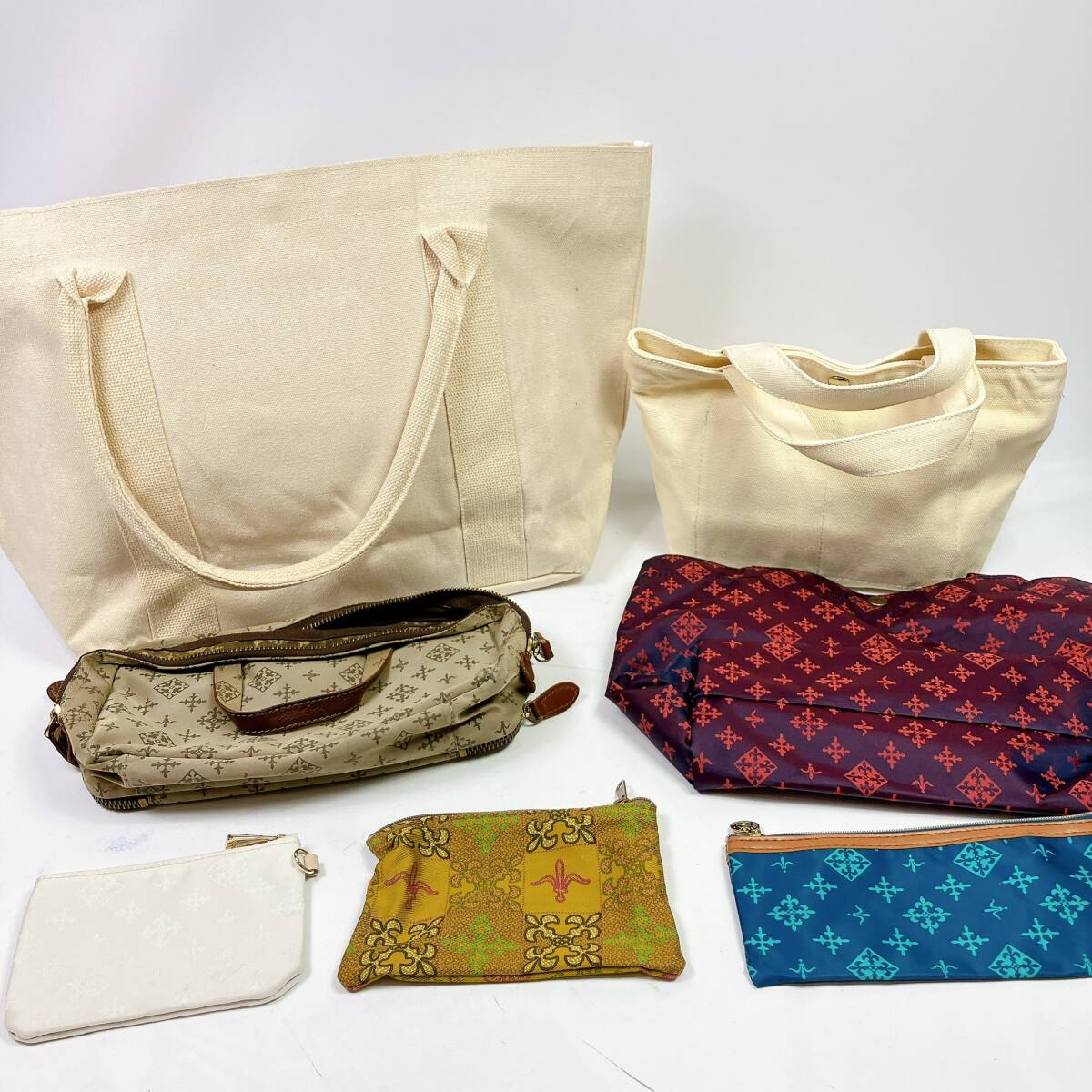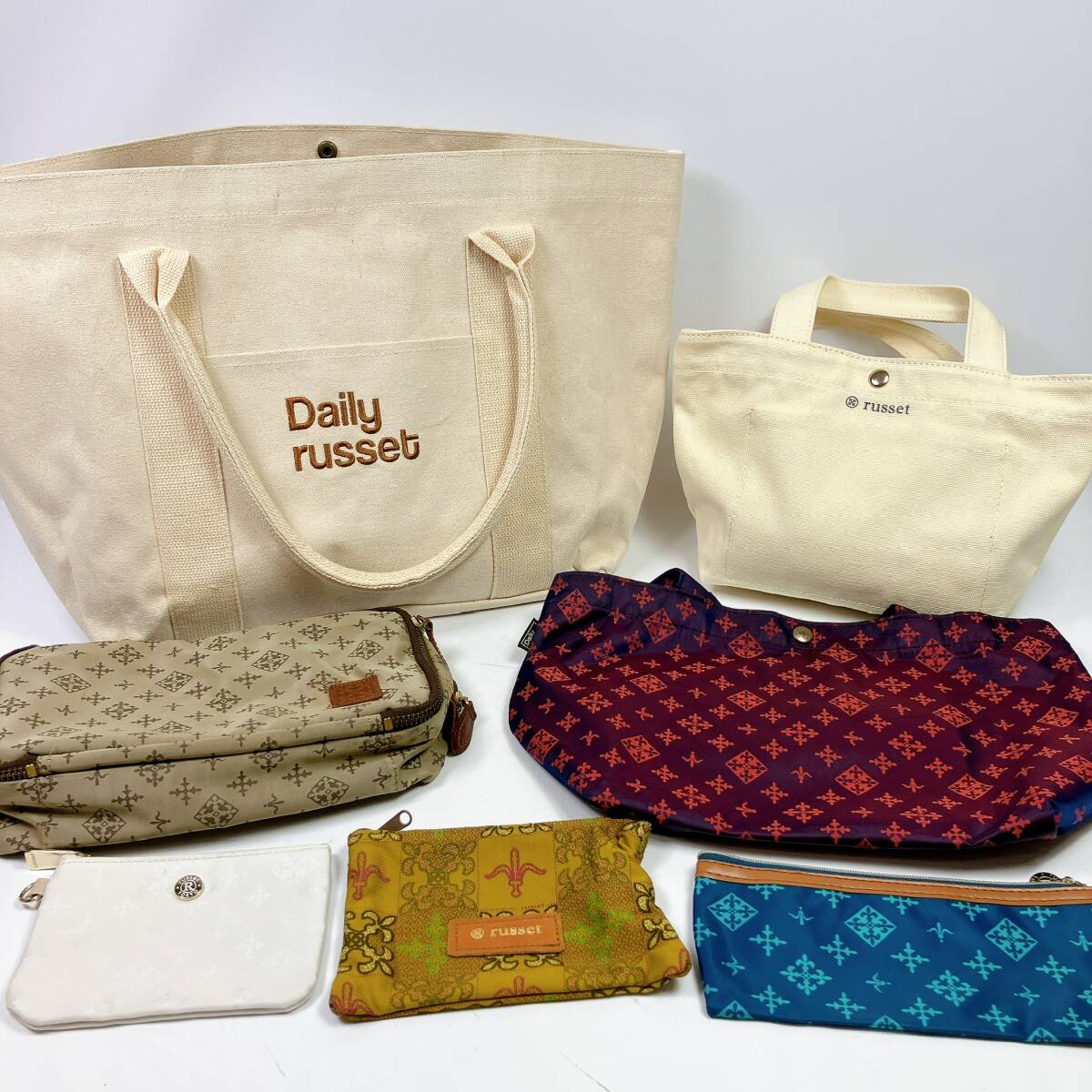 D2239◯ 卸売 russet ラシット トートバッグ ホワイト 白 茶色 ブラウン ポーチ 小物入れ 総柄 キャンバス コインケース ペンケース