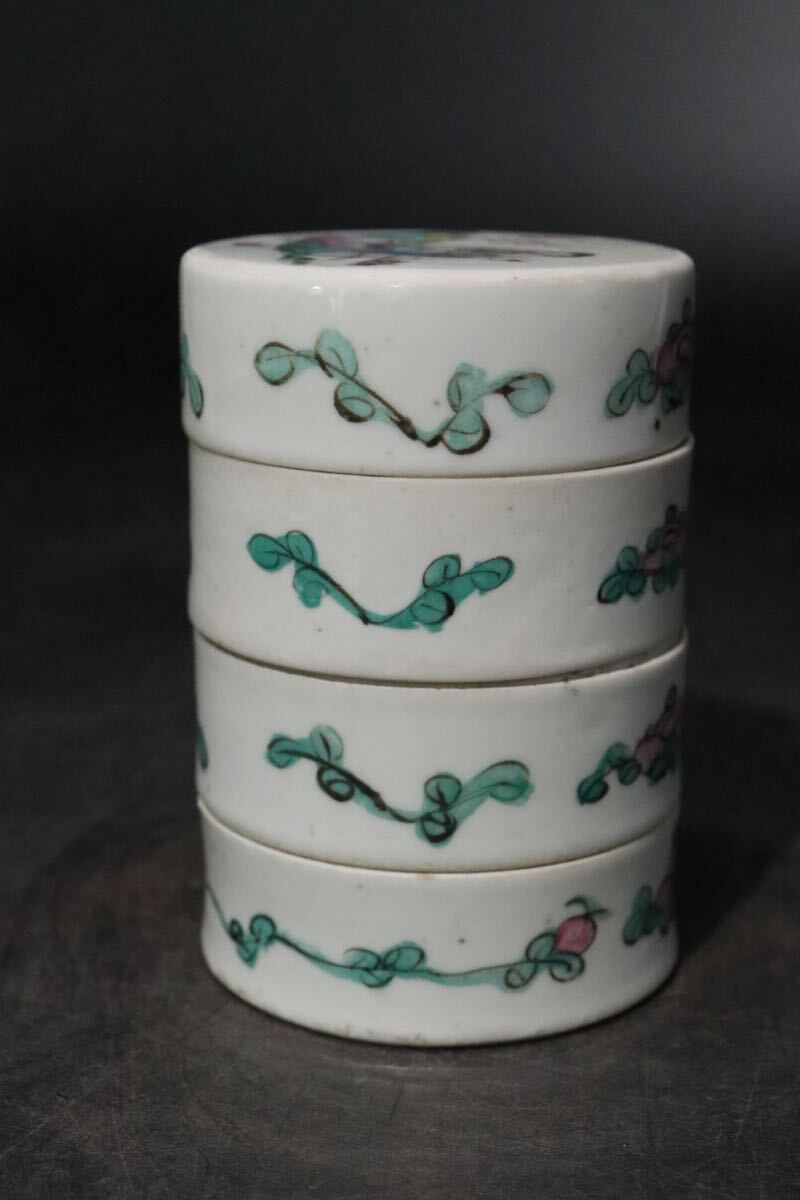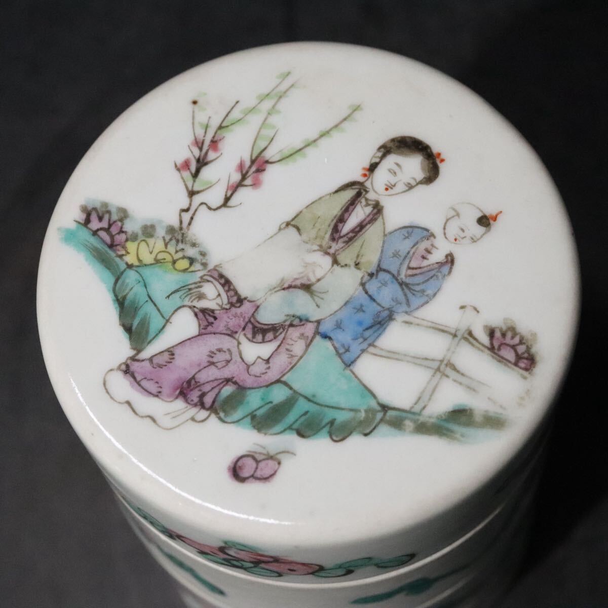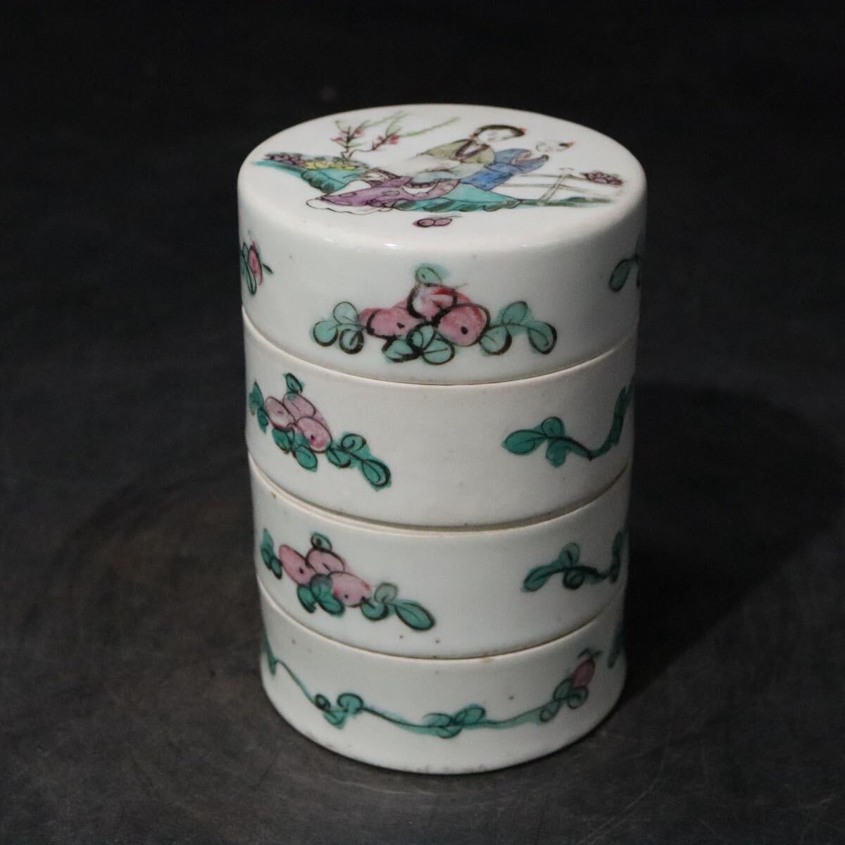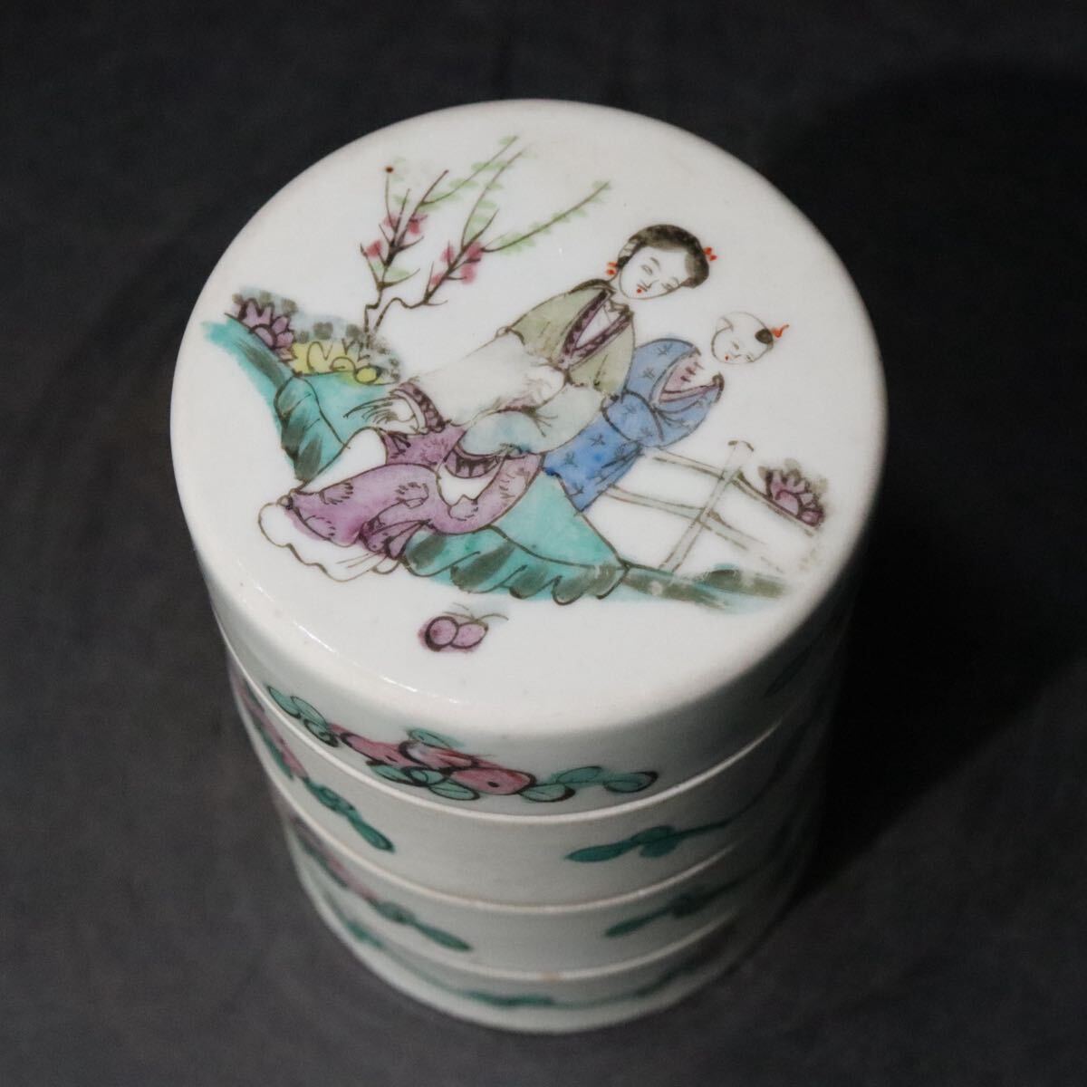 | 時代 中国 民国時代 頃 色絵 人物図 四段 蓋物 / 中国美術 五彩 墨彩 煎茶道具 .B1393 |