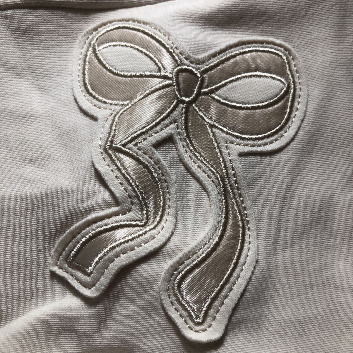 ポケットにあしらったリボンのアップリケがさりげないアクセント。