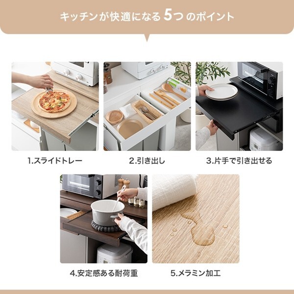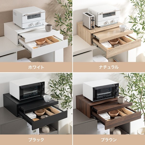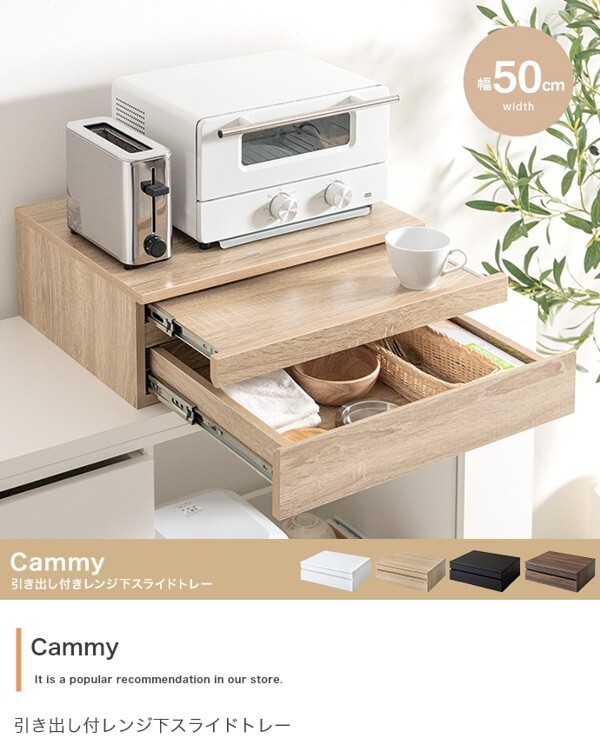 ※現在ご覧の商品ページはブラックのご購入ページとなります。 ヤフオクの仕様上単一ページに複数バリエーションを掲載することができませんので、他バリエーションが希望の場合は別ページでご購入お願い致します。 レンジ下を有効的に活用する『Cammy(キャミー)』レンジ下収納。 ちょい置きできるスライドトレーとワイドな引き出しで、手狭なキッチンをすっきり整理し快適に。 幅50cmタイプと幅80cmタイプの2つのサイズをご用意したため、置きたい場所や用途に合わせお好きな幅をお選びいただけます。 また、レンジや炊飯器などキッチン家電の下に省スペースで設置できるため、今の環境を大きく変えないまま、作業効率を大幅アップすることが可能です。 配達業者を指定いただくことはできません。 沖縄・離島に関しましては、別途配送料が必要となります。 北海道への配送も別途配送料が必要になる場合がございます。 ※別途送料が発生する場合は後ほどご連絡させていただきます。 タイミングによっては在庫切れの場合があります。