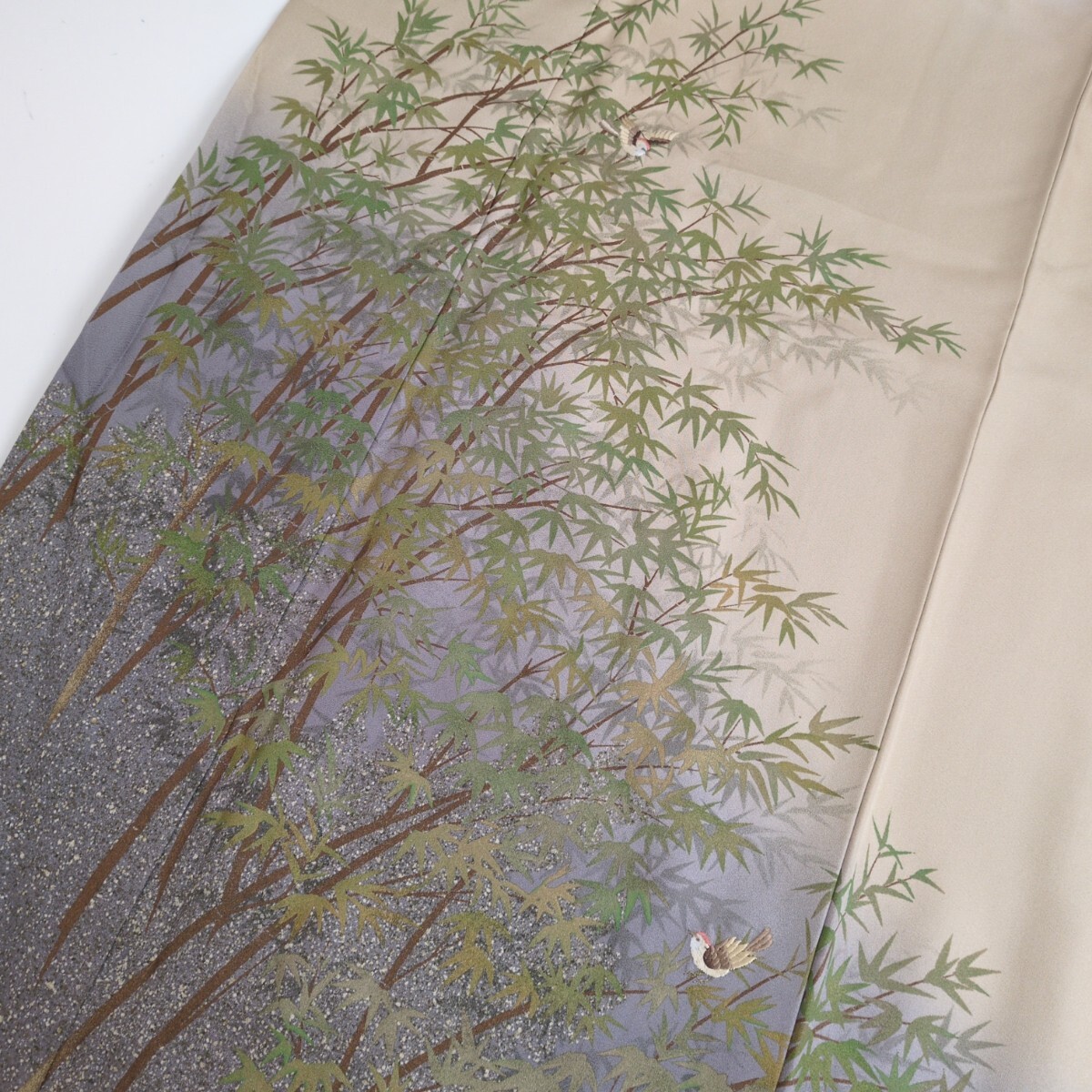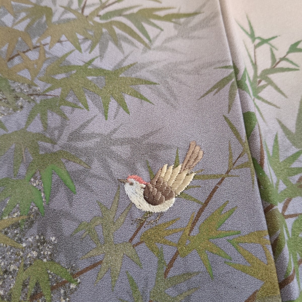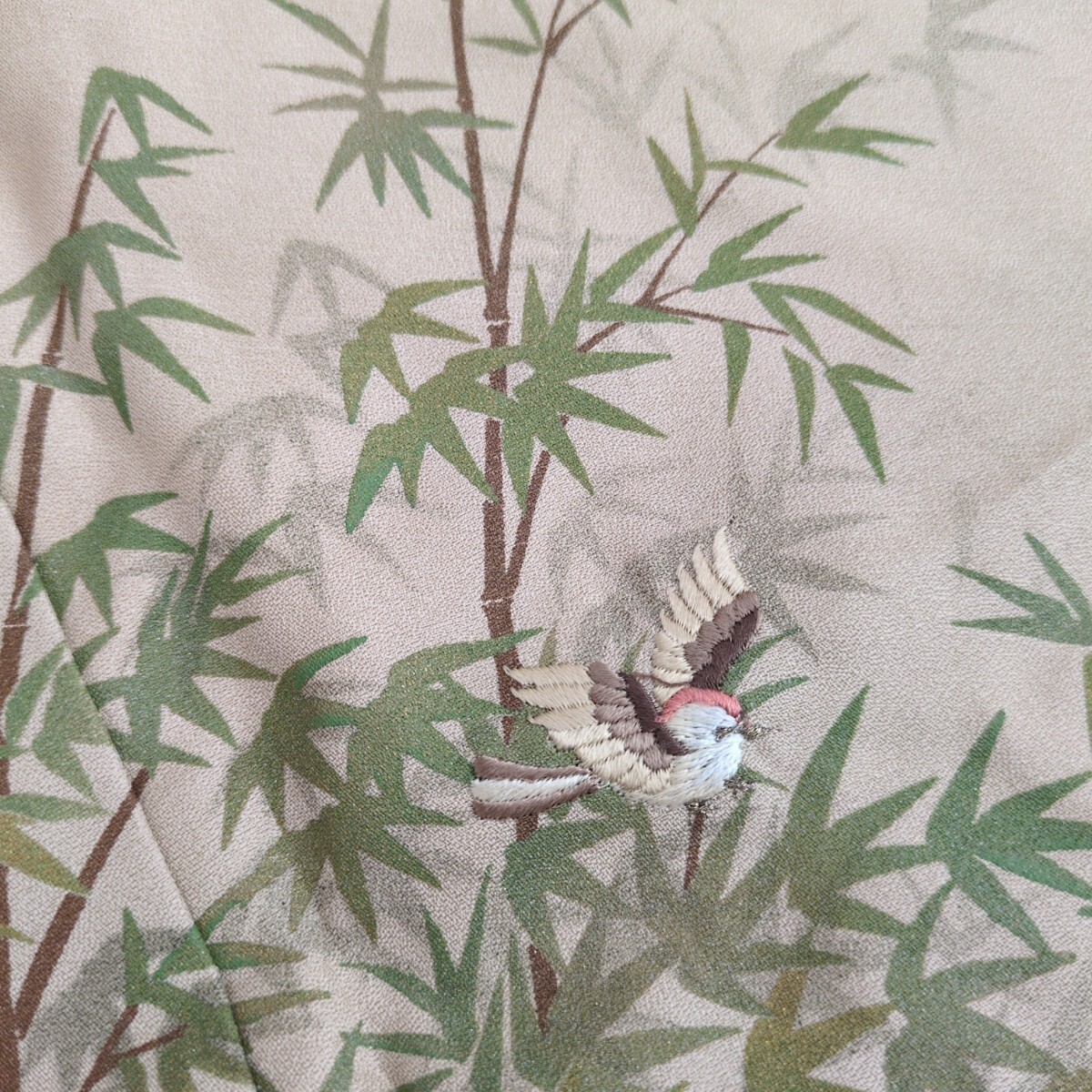 【楓】逸品 染めに刺繍 付け下げ 正絹 紋なし 枝に鳥 袷 着物 KK-2094