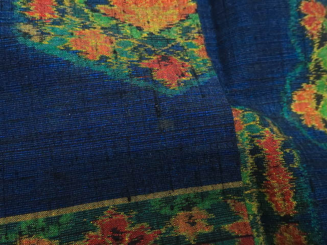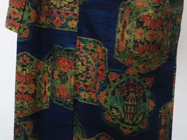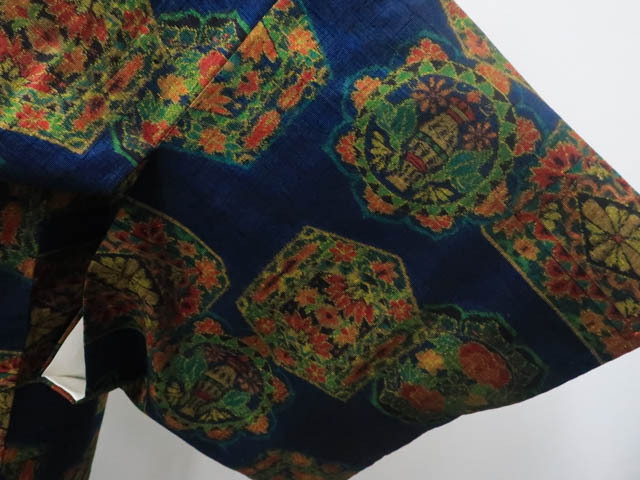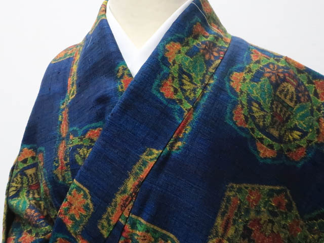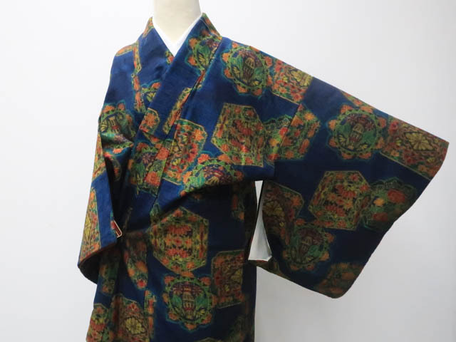 リサイクル商品のため、上衽と八掛けにしみがございますが着用可能なお品です。 地色は 暗い青です。 1枚目の画像が近いお色かと思われます。 素材は正絹です。 |