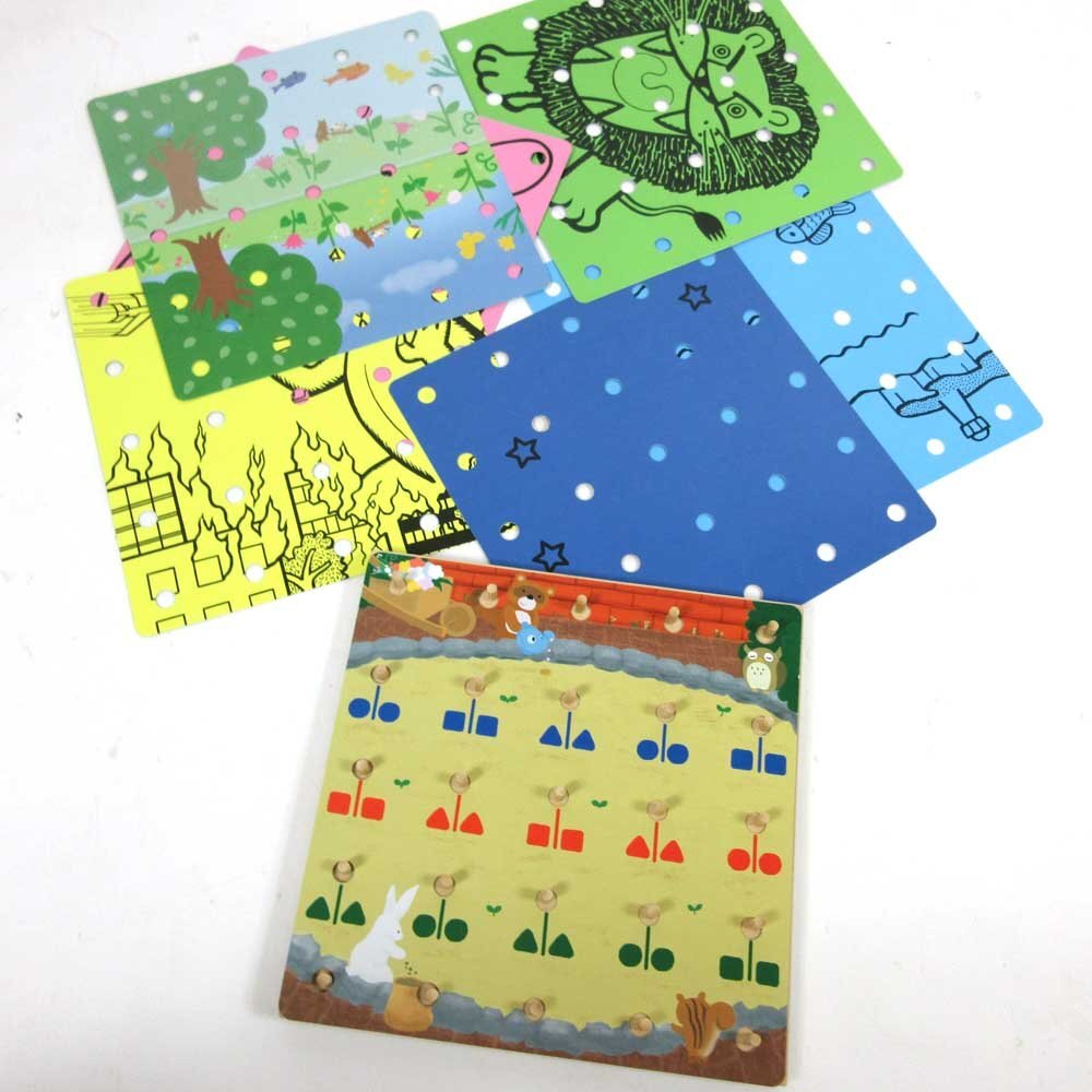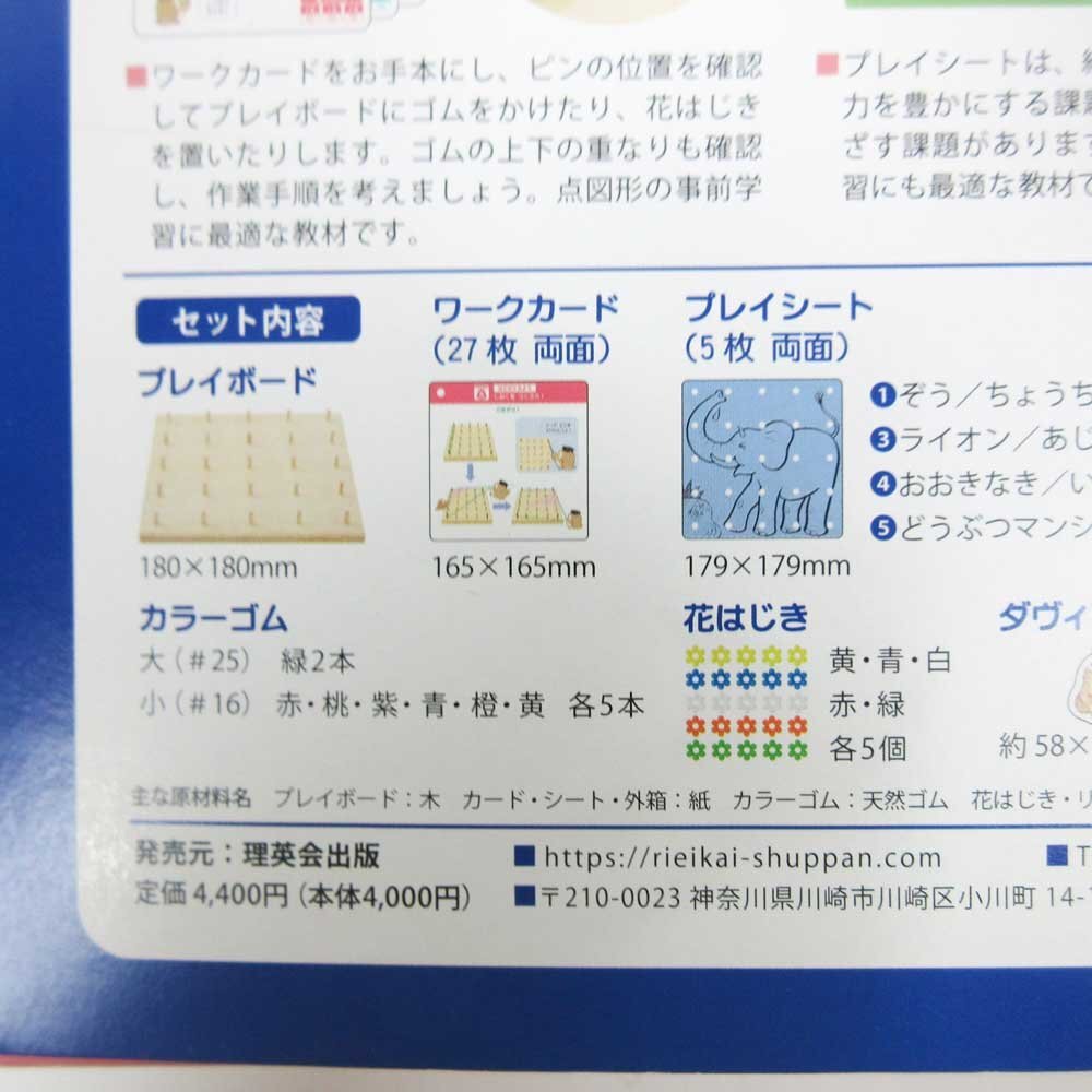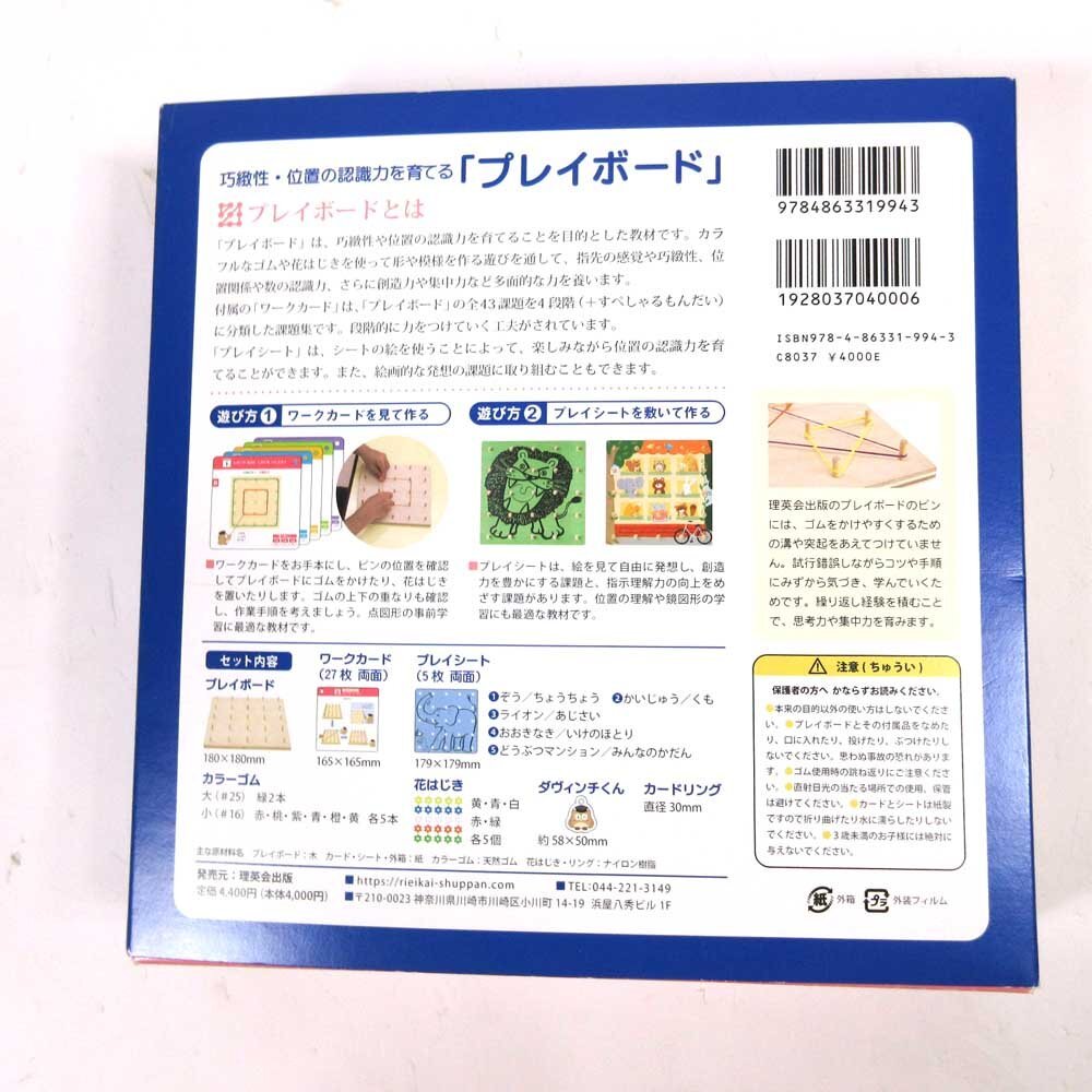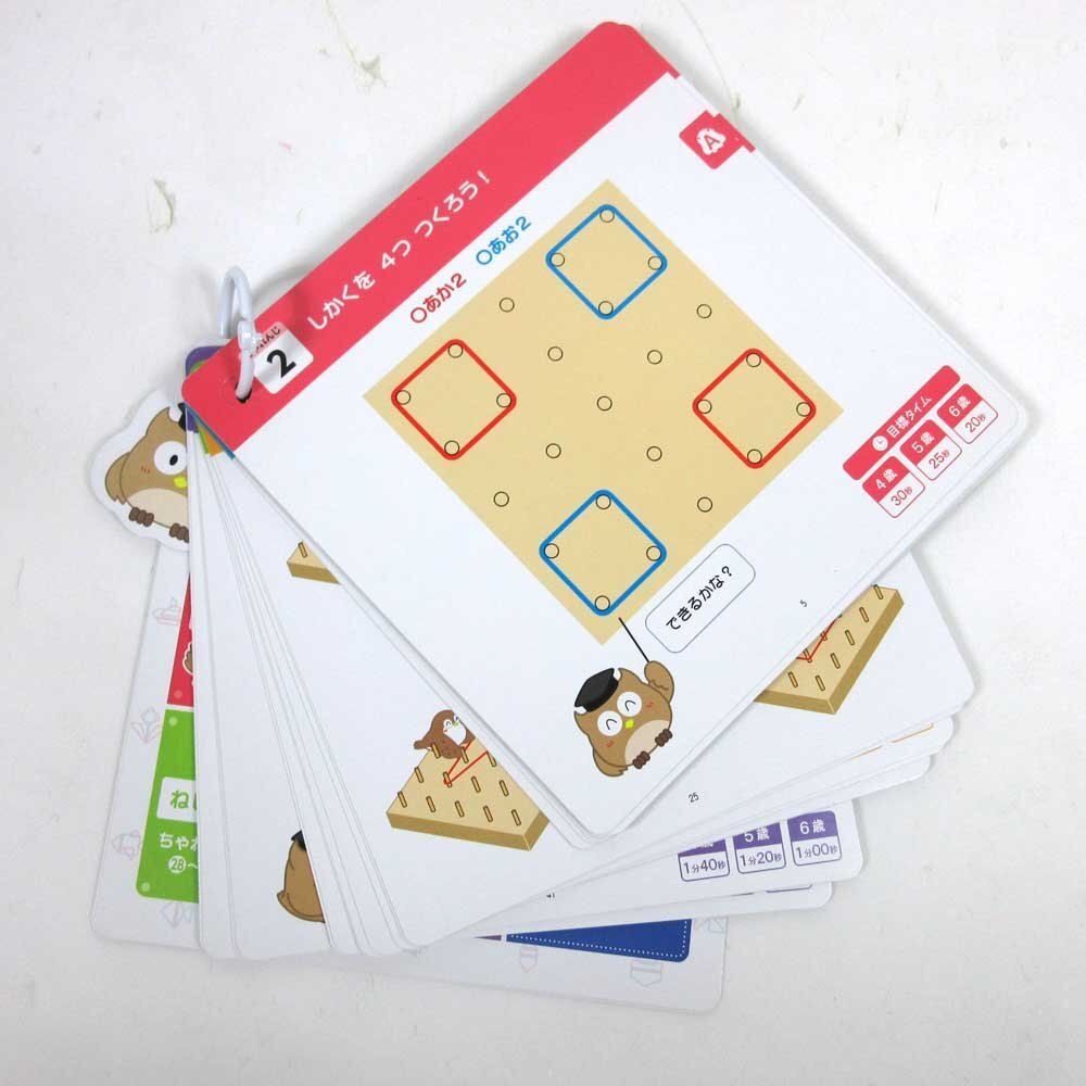 「プレイボード」は、巧緻性や位置の認識力を育てることを目的とした教材です。カラフルなゴムや花はじきを使って形や模様を作る遊びを通して、指先の感覚や巧緻性、位置関係や数の認識力、さらに創造力や集中力など多面的な力を養います。 付属の「ワークカード」は、「プレイボード」の全43課題を4段階(+すぺしゃるもんだい)に分類した課題集です。段階的に力をつけていく工夫がされています。 「プレイシート」は、シートの絵を使うことによって、楽しみながら位置の認識力を育てることができます。また、絵画的な発想の課題に取り組むこともできます。
