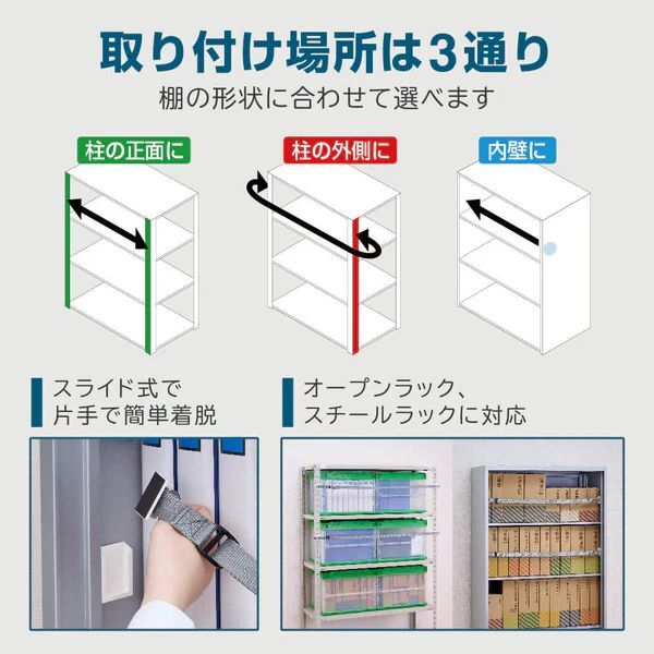 オープンラック以外にも取り付けが可能なので、オフィスにある文書保管用スチールラックなどでも使用可能です。