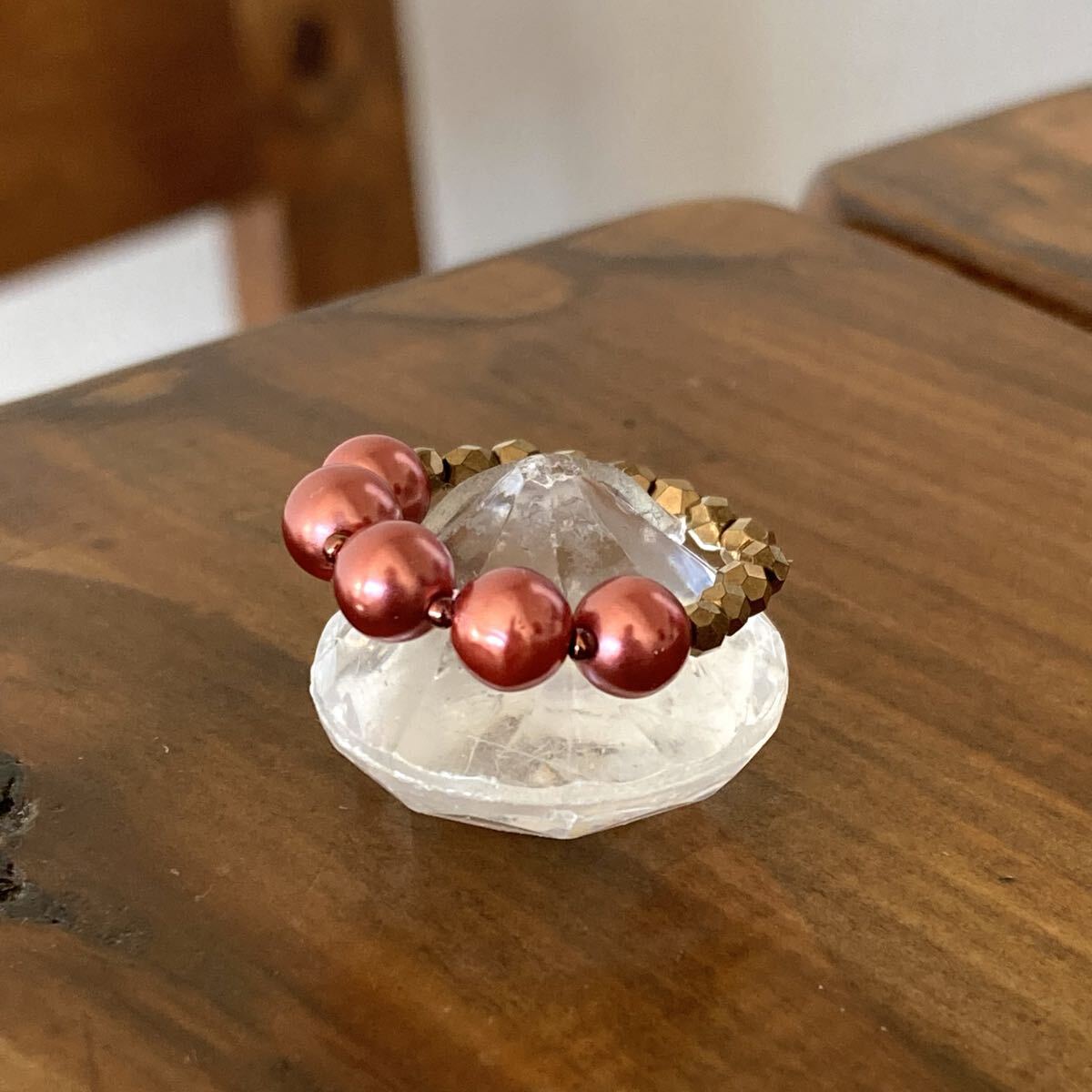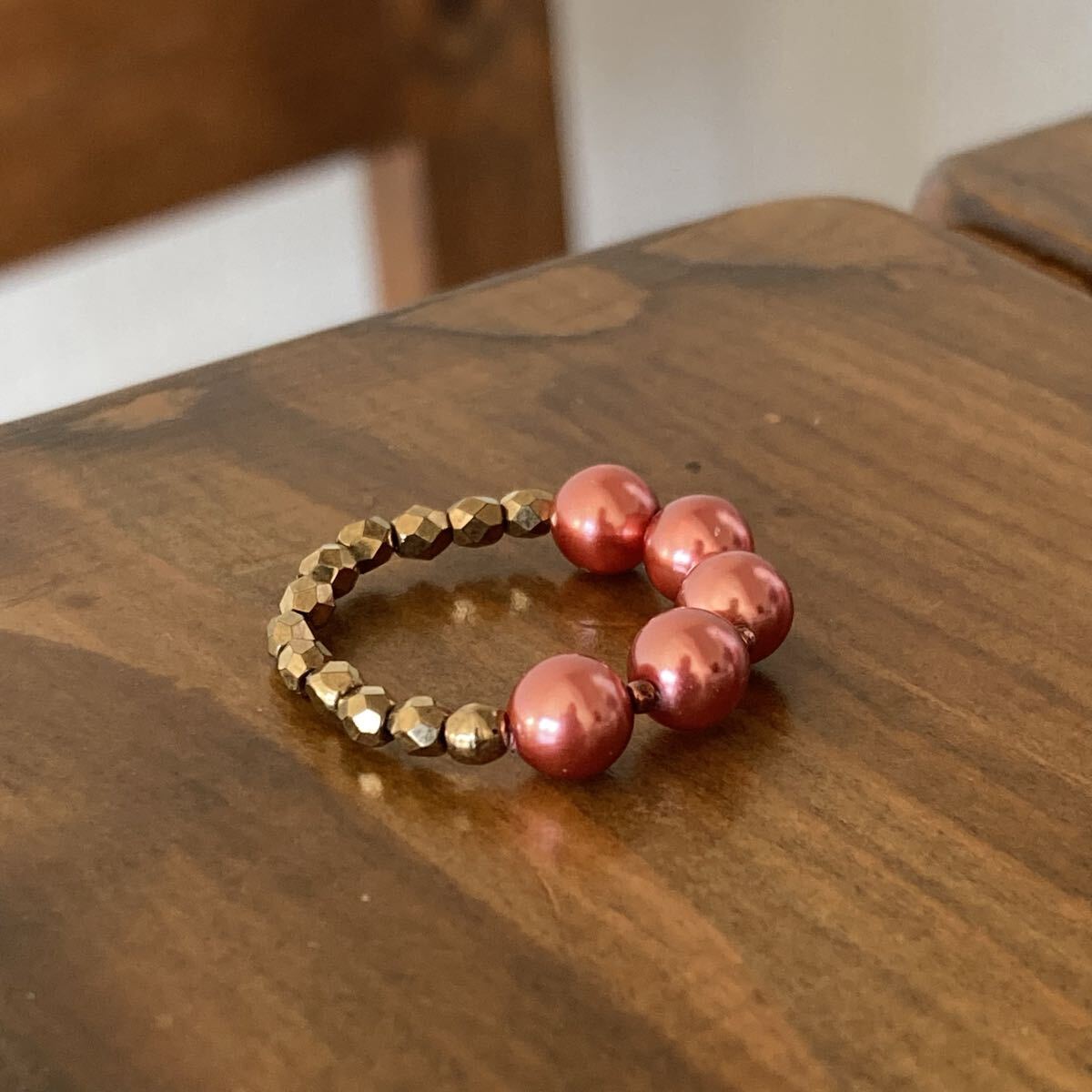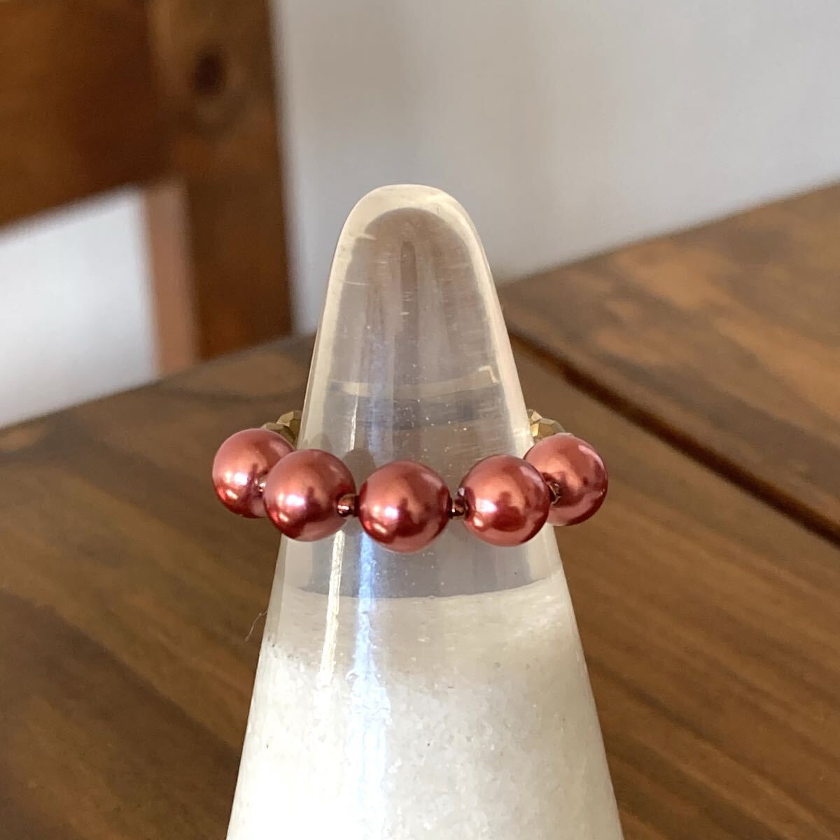 6mmの明るいレッドのパールビーズ、3mmのブロンズのチェコビーズ、ブロンズの特小ビーズで作ったリングです。