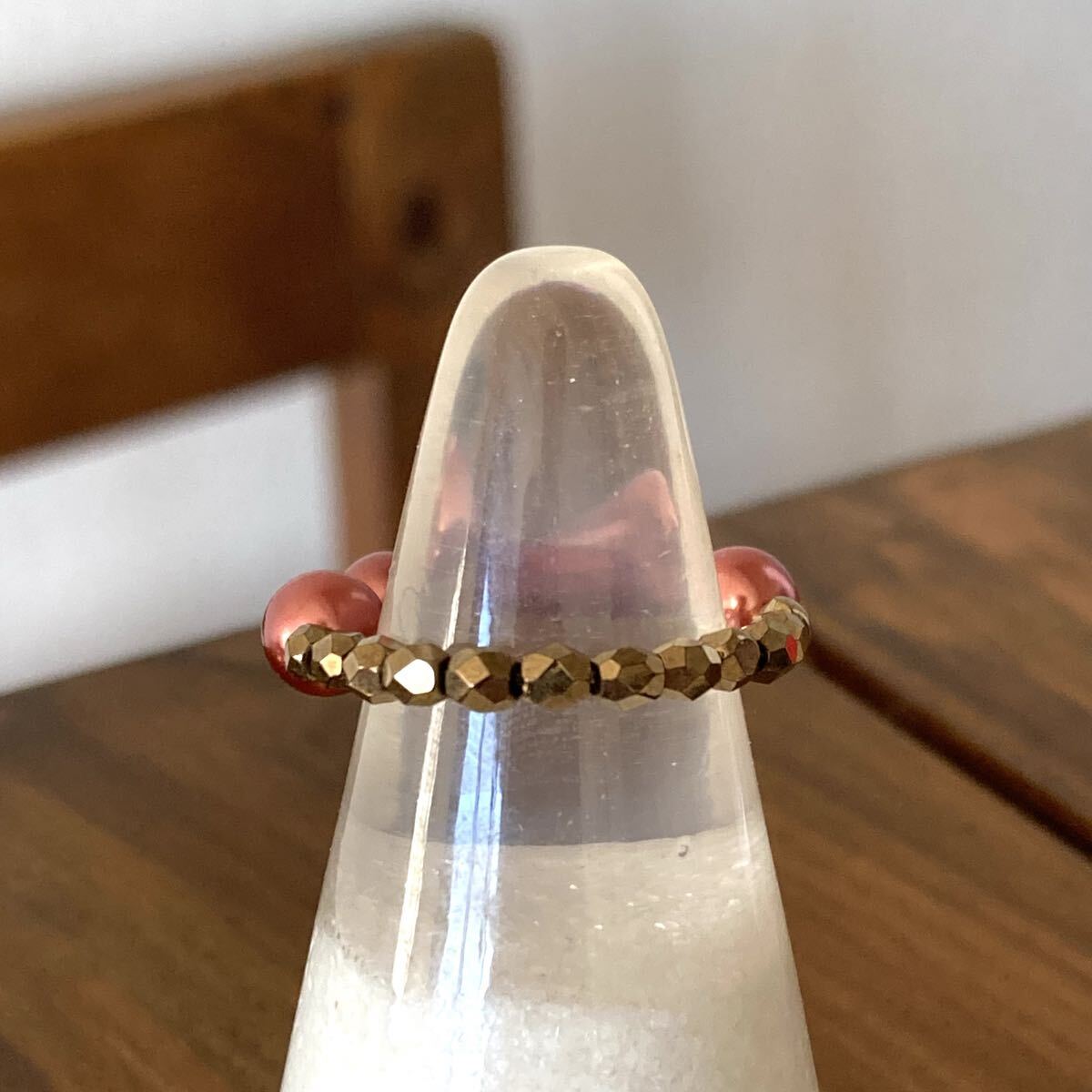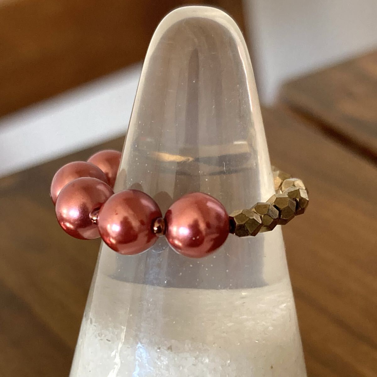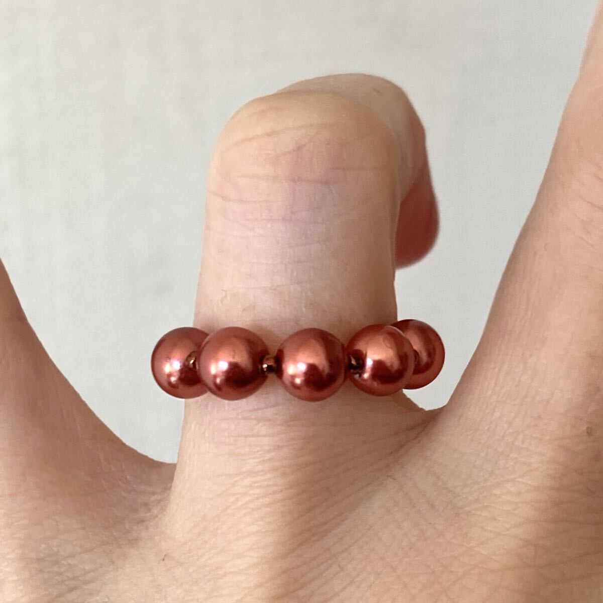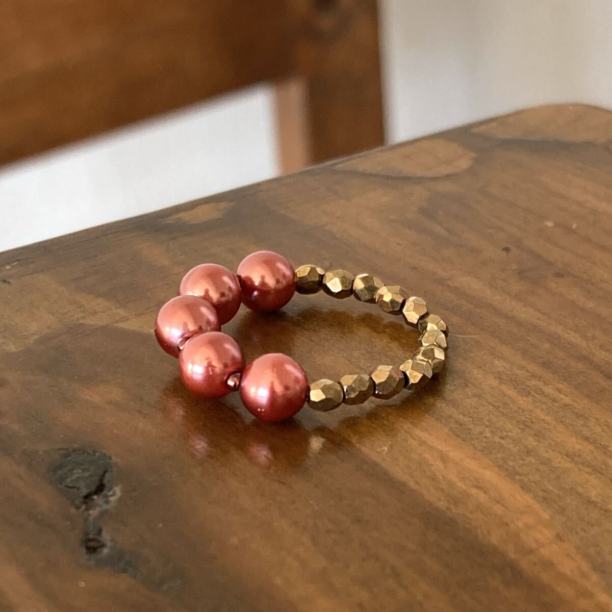 6mmの明るいレッドのパールビーズ、3mmのブロンズのチェコビーズ、ブロンズの特小ビーズで作ったリングです。