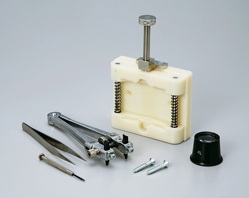 時計ホルダー。ピンセット、時計裏蓋用オープナー、マイナスドライバー、キズミ(ルーペ)のセット。裏蓋がスクリューバック式の電池交換や機械内部を修理する時に裏蓋を開閉する時に使う便利な工具セットです。