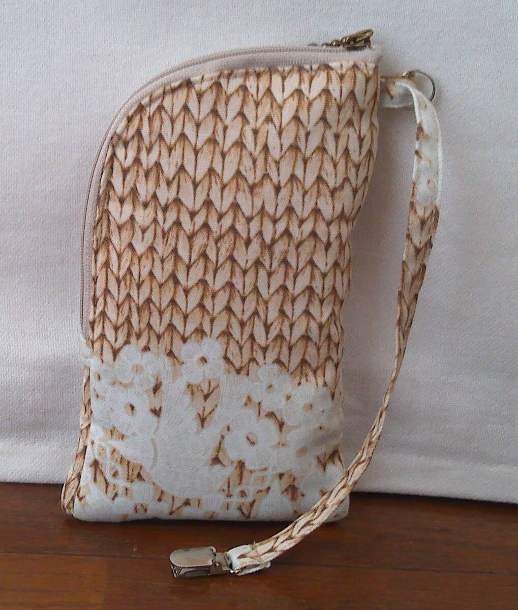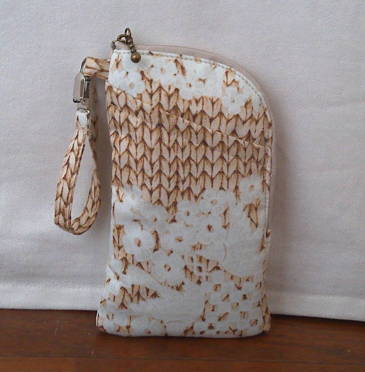 | スマホケース・ファスナー★茶ベージュニットプリント地花鳥 |