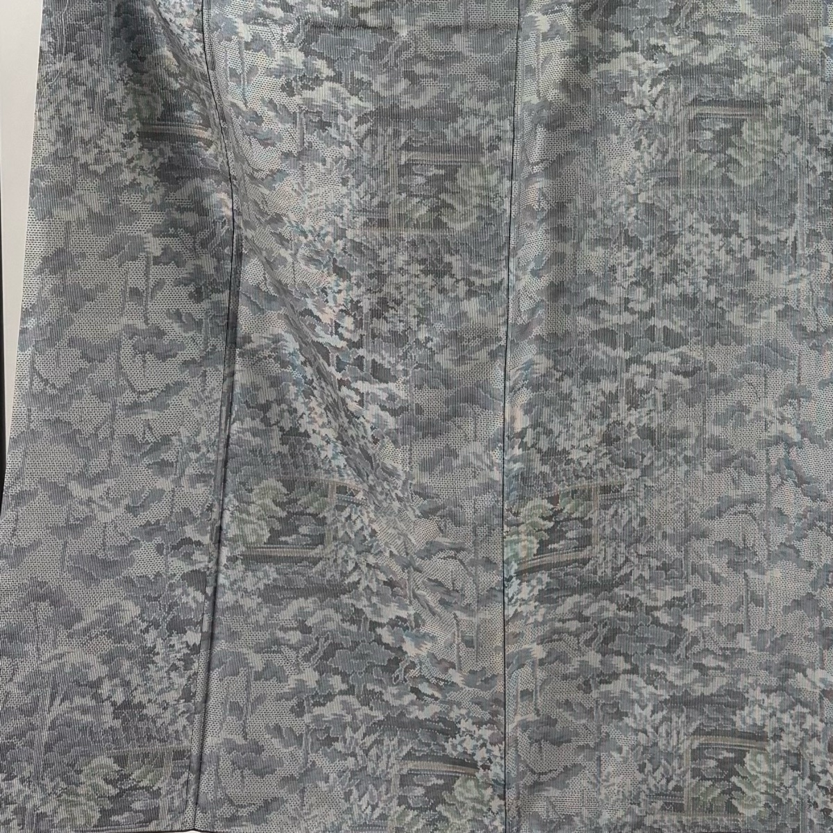 | 紬 秀品 樹木 建物 青灰色 袷 身丈152 裄丈63.5 S 正絹 【中古】 |
