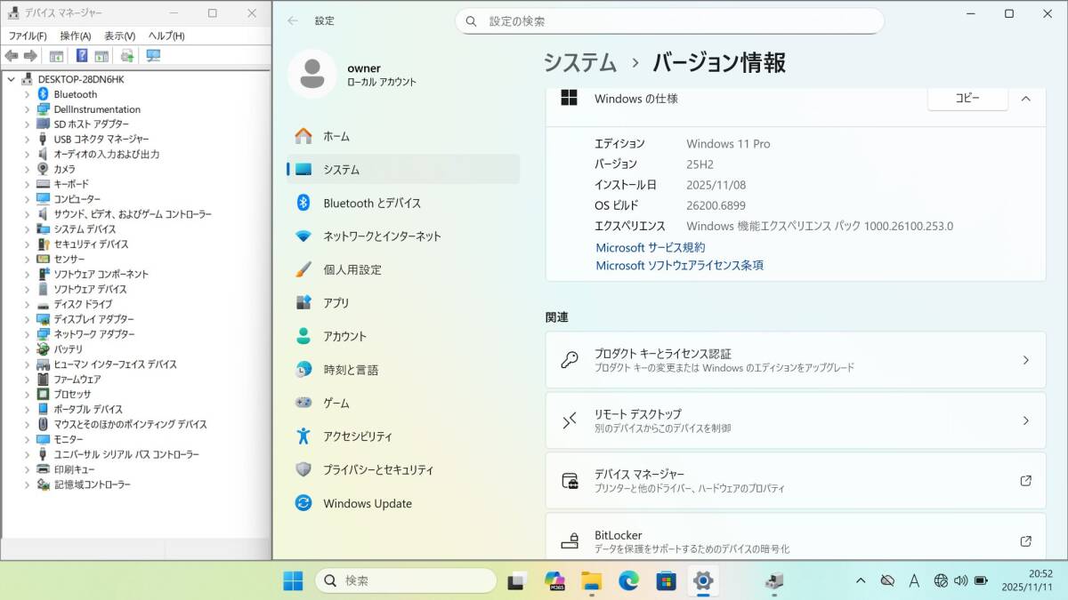 OSはWindows11Pro(25H2)をUSBブートでクリーンインストールと最新のアップデートを行いました。
