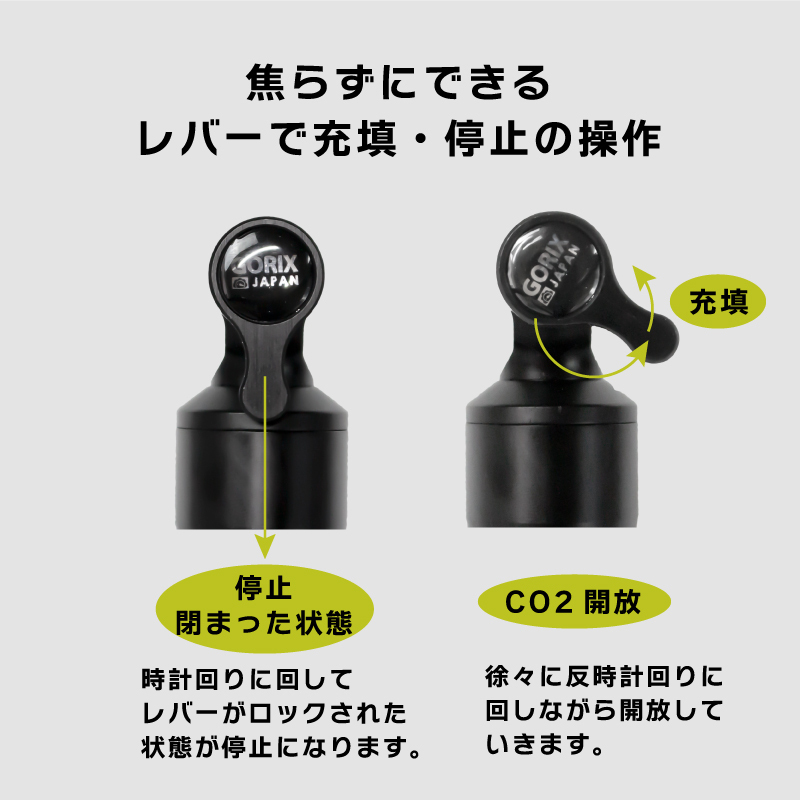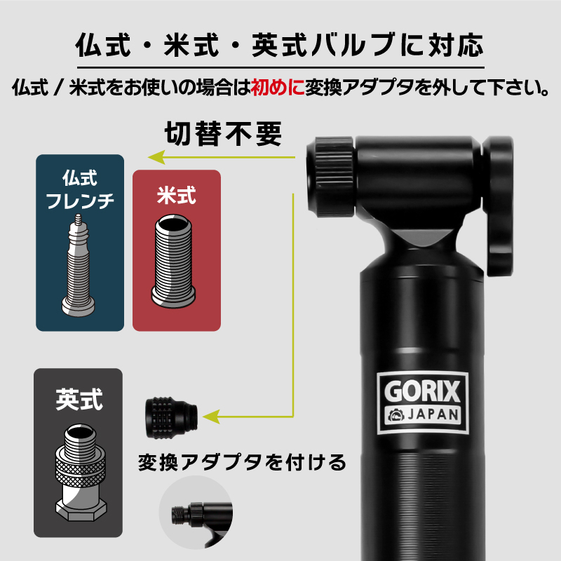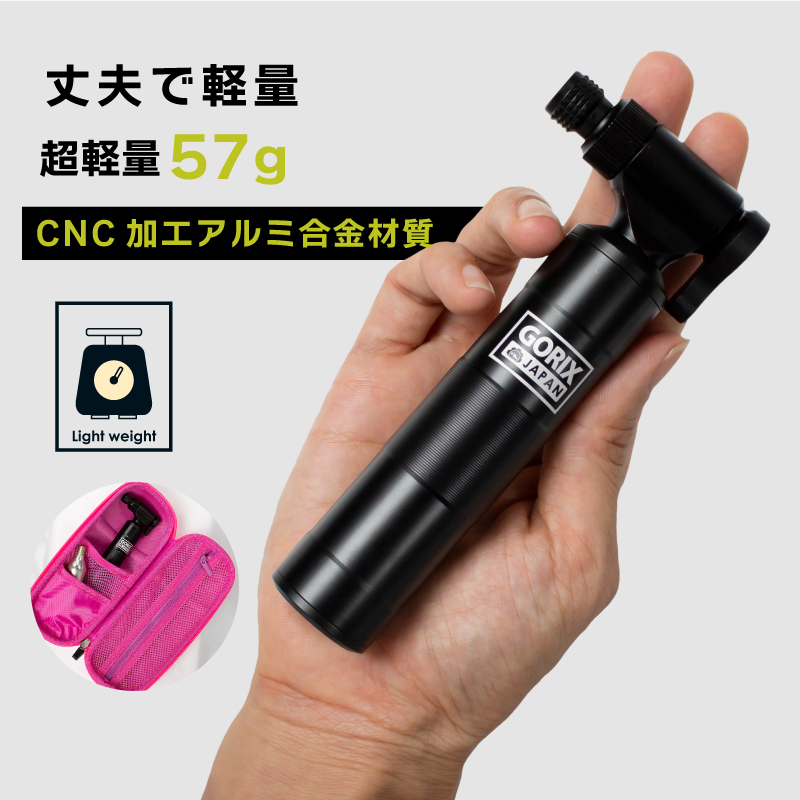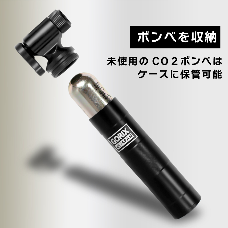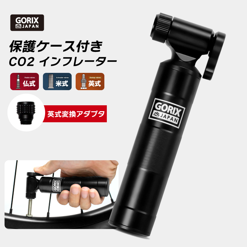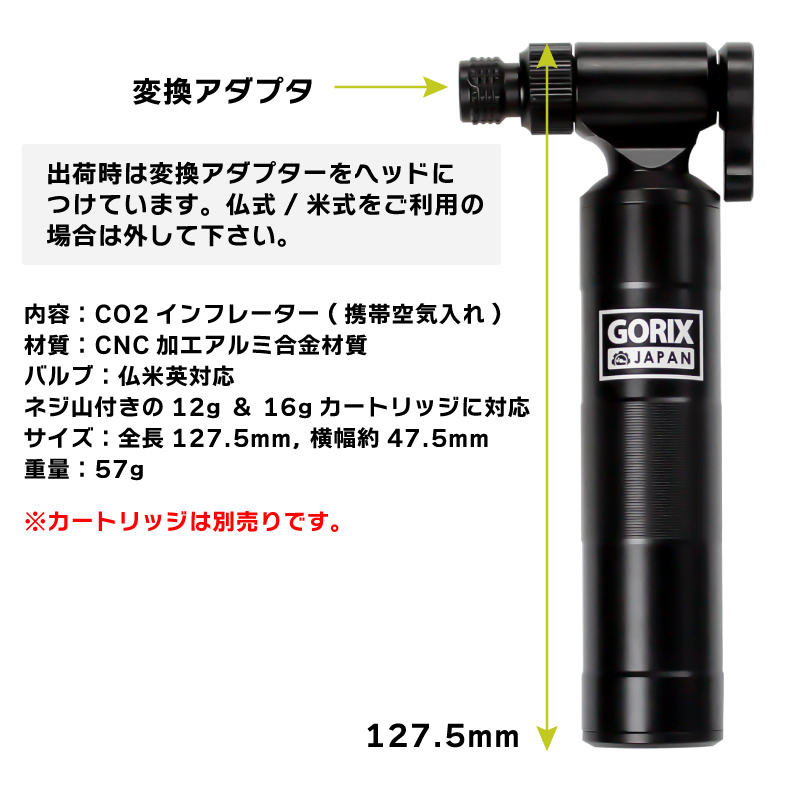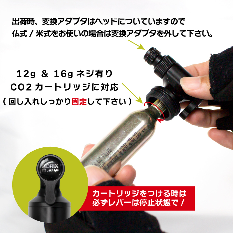 瞬間エアチャージできるので人気の高いCO2ボンベ式の携帯空気入れ 走行中にパンクをした時も一瞬で空気を注入できるのでパンク修理作業も早々と終わらせれます。 GX-CO27はケース式になっているので未使用のボンベは中に保管が可能です。 また充填の時、直にカートリッジに触れないので冷却による凍傷を防ぐことができます。 フレンチバルブ(仏式)、米式、英式と3バルブ対応なのでロードバイクやクロスバイク、MTBなど様々な自転車に。 [操作しやすいレバー式] 停止から充填までレバーで調節できる。 [3バルブ対応] フレンチバルブと米式は切替不要でお使い頂けます。 英式は変換アダプタを使用してお使い頂けます。 [保護ケース] 保護ケースは未使用のCO2ボンベを保管する事が可能。 また充填時はボンベに触らなくて冷却による凍傷を防ぎます。 [CO2ボンベ] 12gと16g(ネジ有り)CO2カートリッジに対応しています。 [軽量で丈夫] 軽量なので携帯ポンプとしてとても重宝します。 CNC加工アルミ合金材質 商品内容CO2インフレーター(携帯空気入れ) ※CO2カートリッジは別売りです。 材質CNC加工アルミ合金材質 バルブ仏米英対応(英式はアダプタをお使い下さい) ※ネジ山付きの12g & 16gカートリッジに対応 サイズ全長127.5mm, 横幅約47.5mm (インフレーターヘッド横幅30.5x高さ40x奥行16mm;カートリッジケース長さ90mm, 外径25mm) 重量57g 操作手順附属説明書にてご参考ください。 ※出荷時は変換アダプターをヘッドにつけています。仏式/米式をご利用の場合は外して下さい。 《ご注意》 ・商品は入荷によりキズがある場合があります。 ・保証対象外になりますのでご了承お願い致します。 ・ディスプレイ環境により実物と色が異なる場合が有ります。 ・入荷時期により予告無く一部仕様変更する場合が有ります。 |