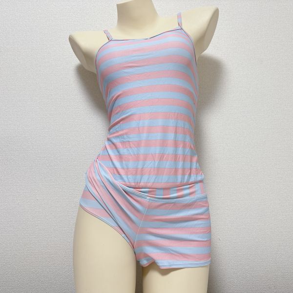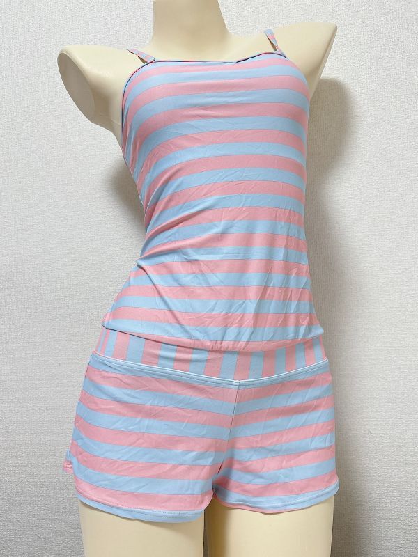 27グレイス女子競泳水着160(Lサイズ程度)★スカート・キャミソールタイプ・股上ハイレグ★光沢パステルピンクブルーボーダー★男性も