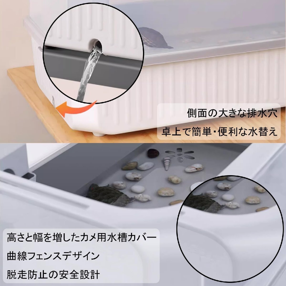 底部排水: 亀の水槽 亀水槽 底部排水口は汚れた水を素早く排出し、水交換効率を効果的に向上させ、水槽内の清潔で整った環境を維持します。亀にとって安全で快適な飼育環境を提供します。