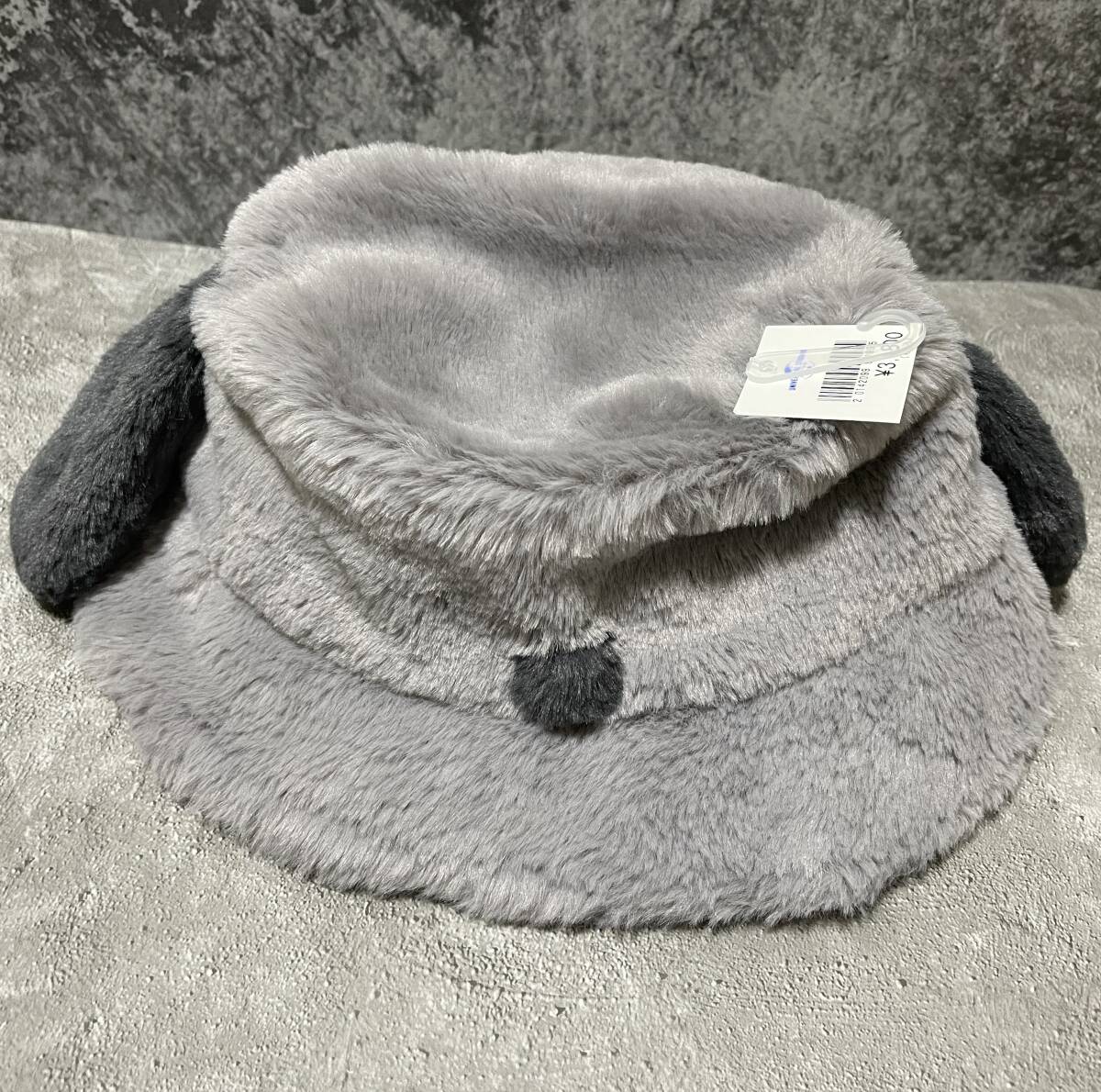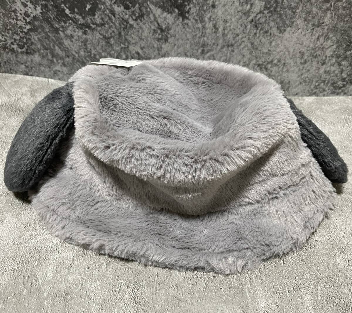 グレーのふわふわ素材に、黒い“垂れ耳”が付いた可愛いデザイン。