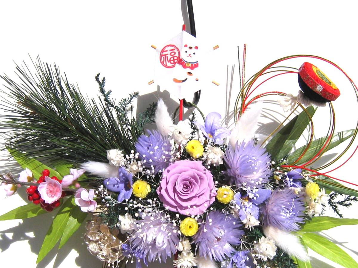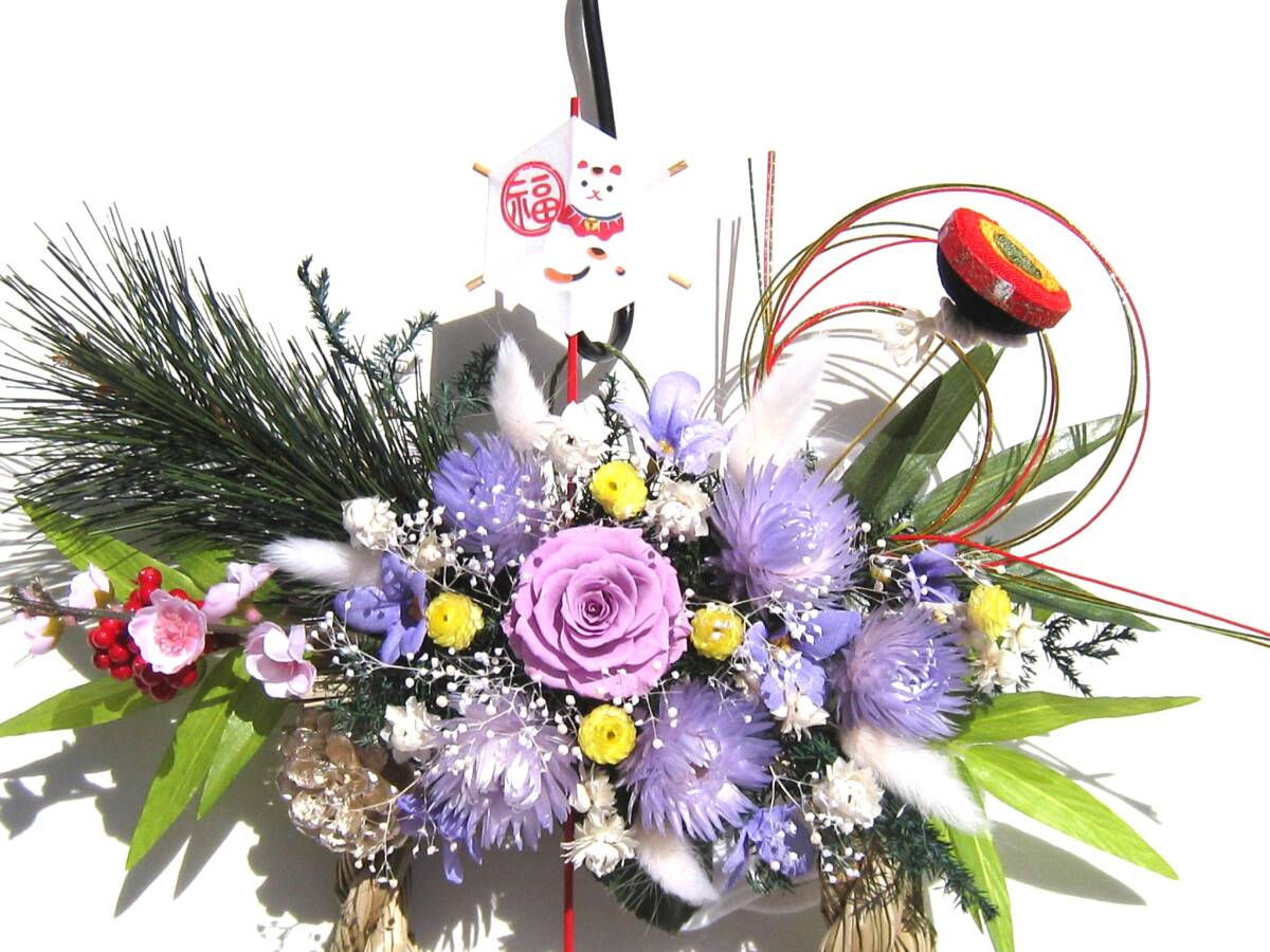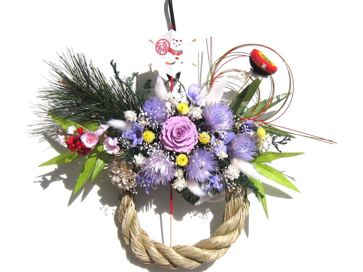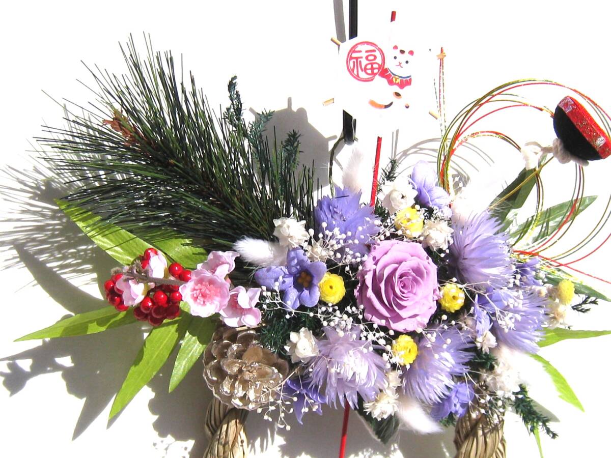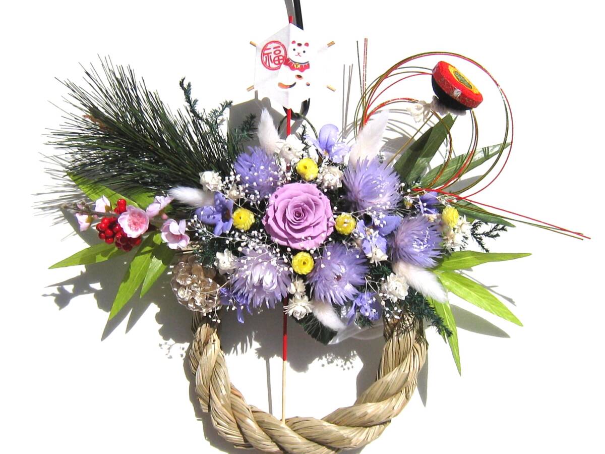 藁の丸しめベースに松竹梅、千両、紫の小花、プリザーブド薔薇、シルバーデージー、