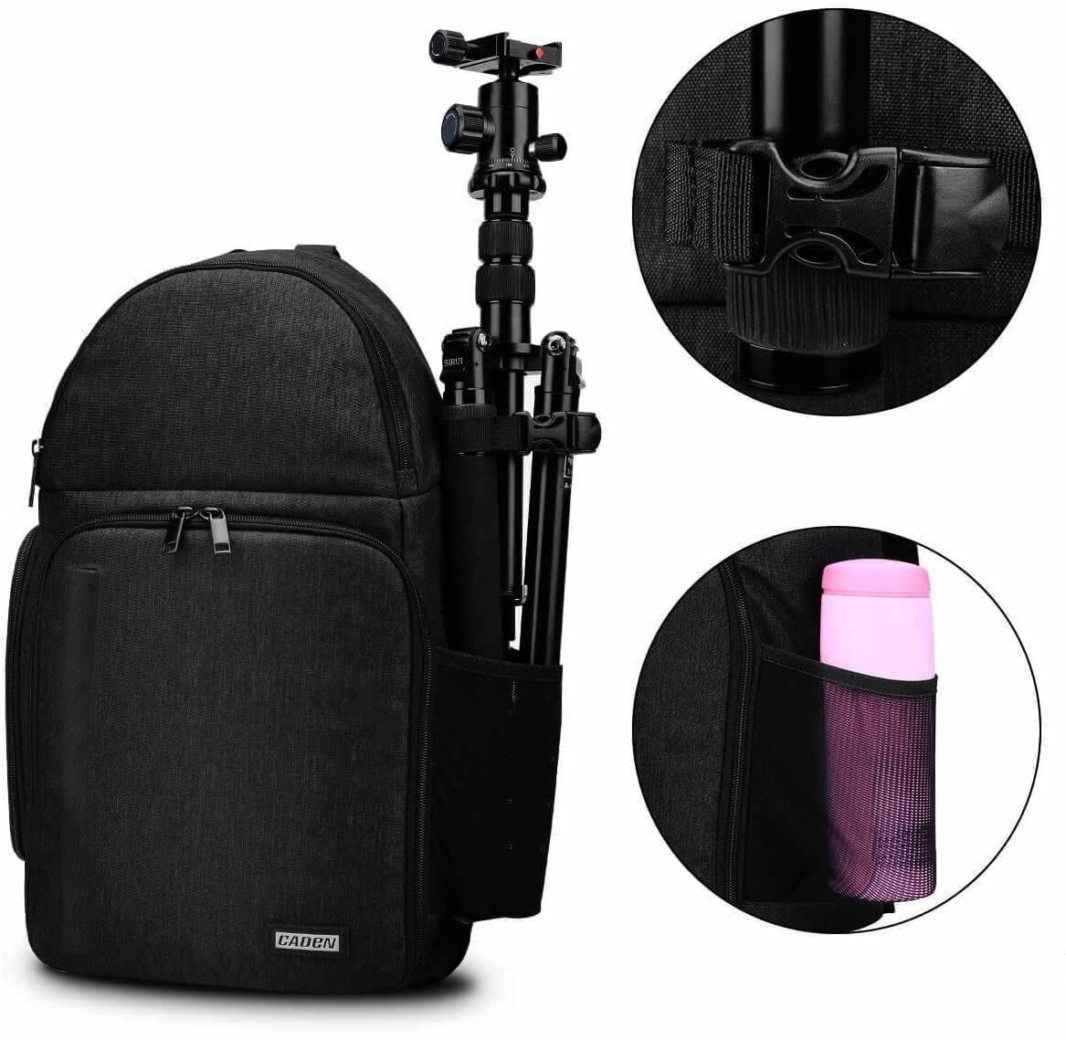 サイドには三脚ホルダー、2つのスチールプラスチックバックルで、調節可能なストラップが三脚をしっかりと固定します。