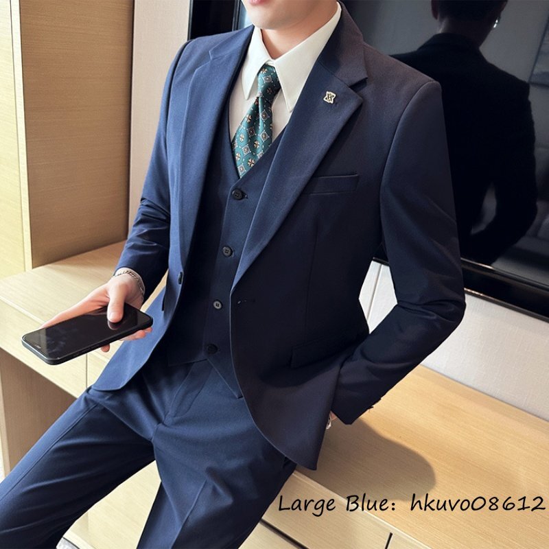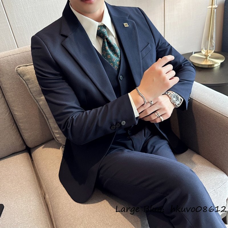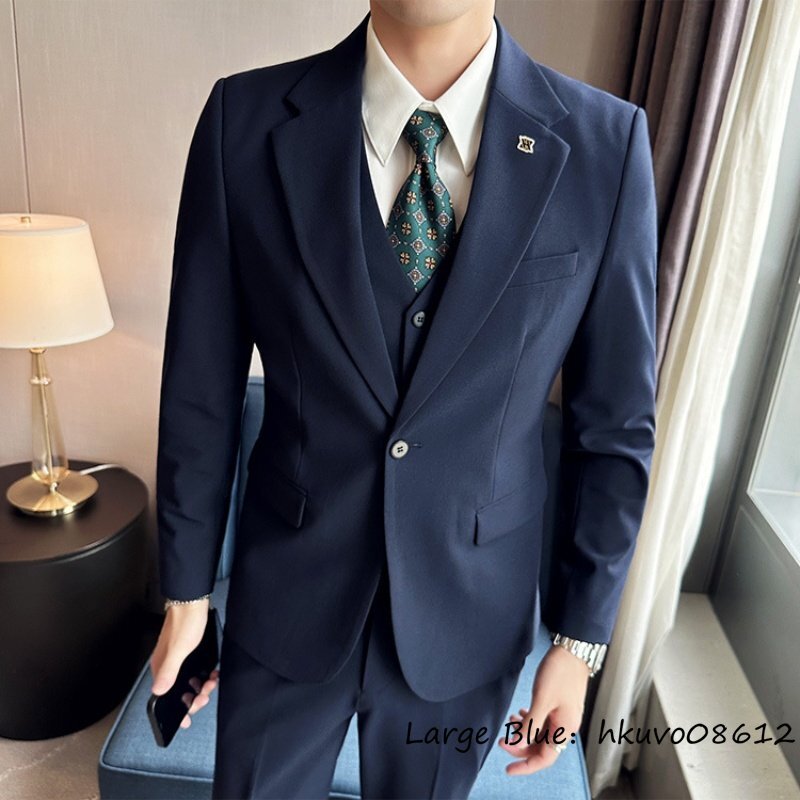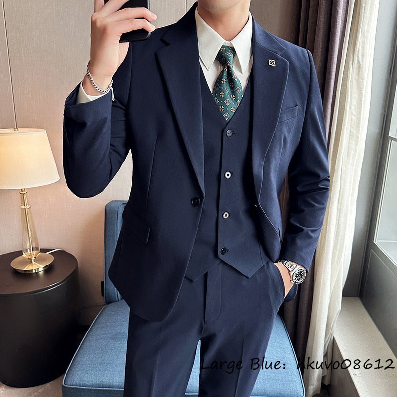 新品 メンズ スリーピース スーツセット 結婚式 スタイリッシュ 高級スーツ スリム 細身 3点セット 無地 一つボタン 紳士 ネイビー S