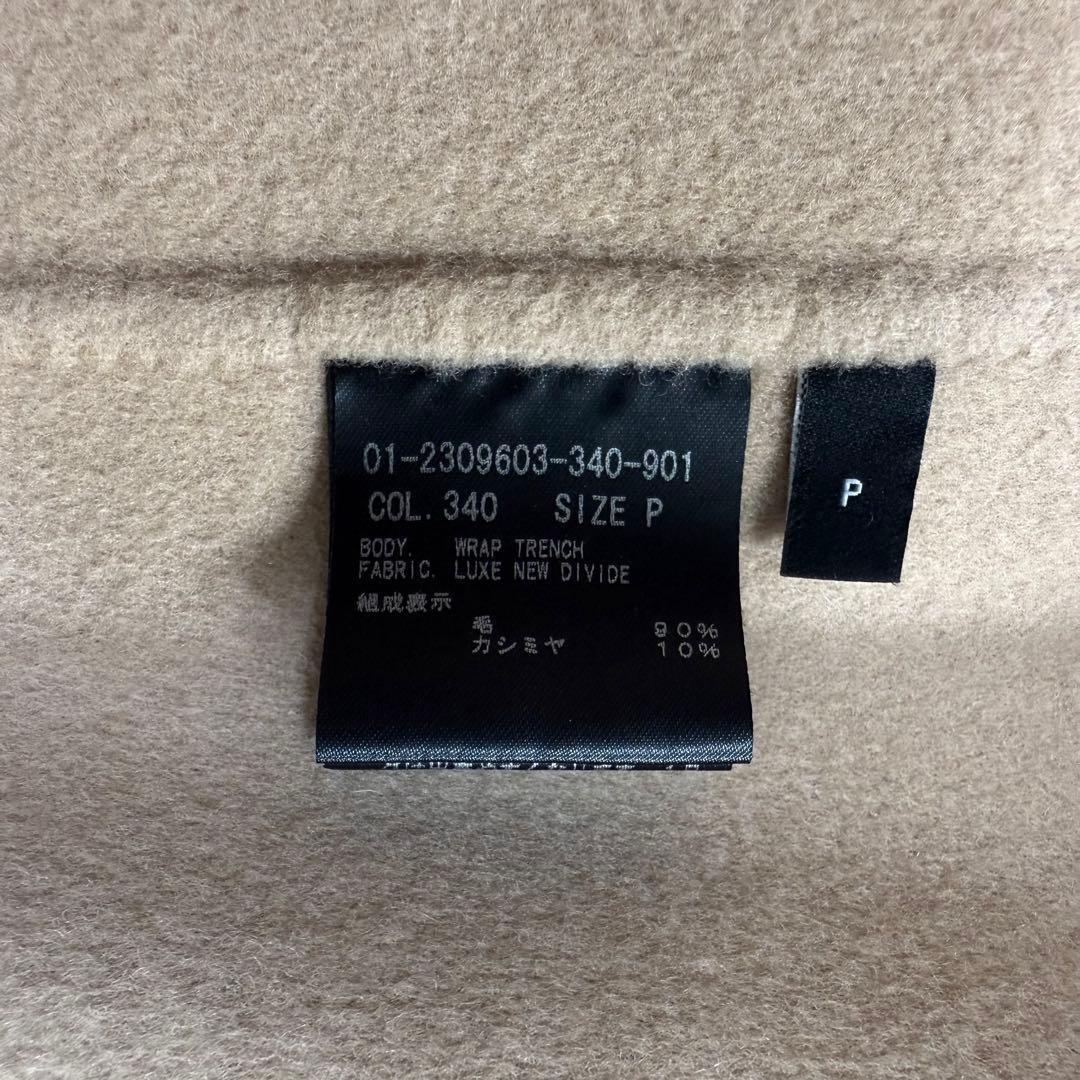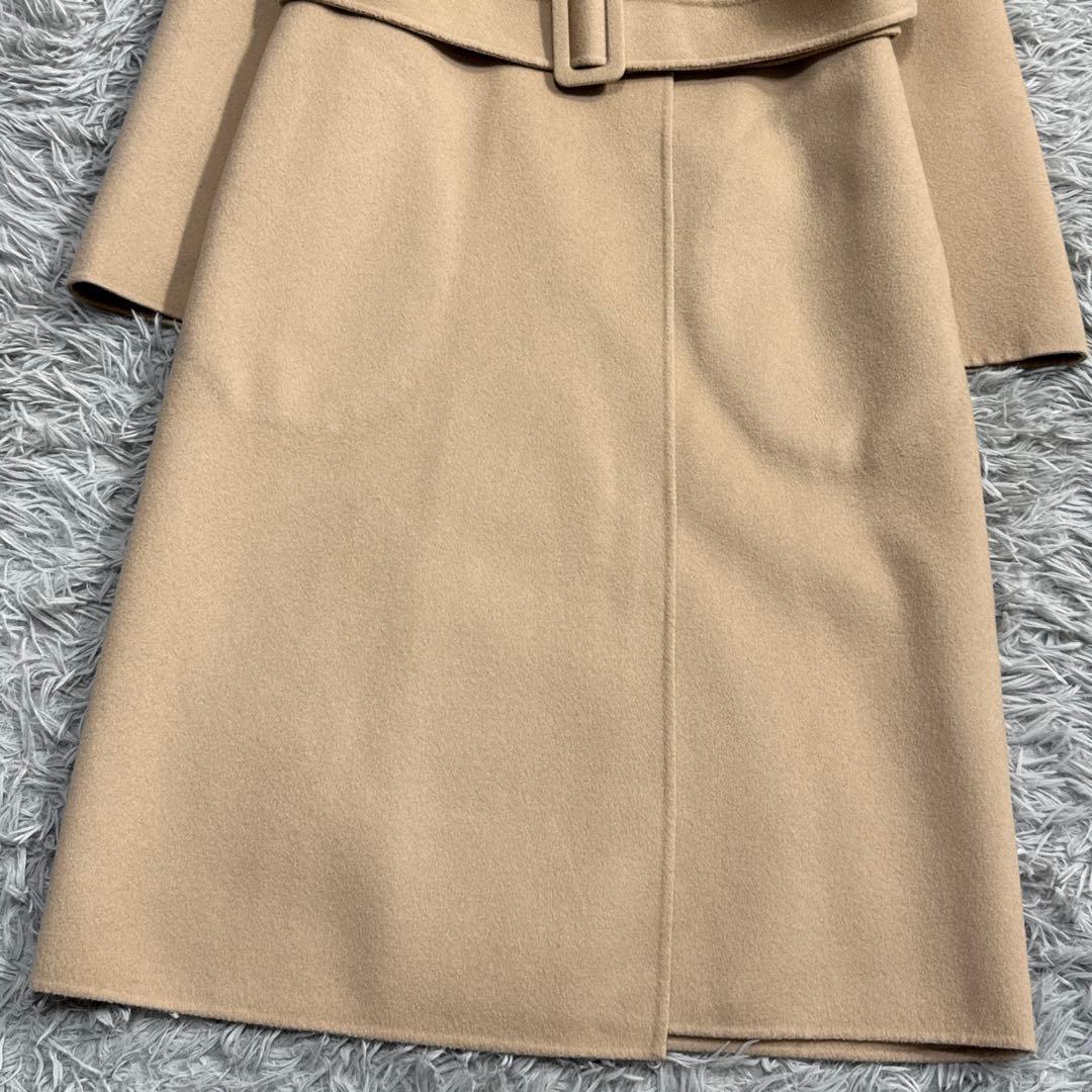 大きめラペルとウエストベルトが特徴のラップトレンチデザインは、直線的でクリーンな印象を引き立て、