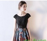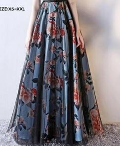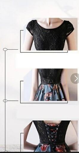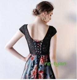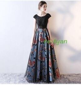 レース切替サテンチュールのロングドレス。気品に満ちたとてもエレガントで上品なひとクラス上をいく一品です。トップス部分は黒の花柄レース。ウエストから裾にかけてはクラシカルな花模様のプリントが施された灰青のサテン地の上にチュールを重ねた華かつ上品でエレガントなデザインになっています。パーティやコンサート、結婚式の二次会にと、様々な華やかなシーンで活躍してくれる一着です。背中は網紐掛けなので、紐の締め具合を調整することでサイズに余裕をもって着用いただけます。裏地有。胸パット付き。