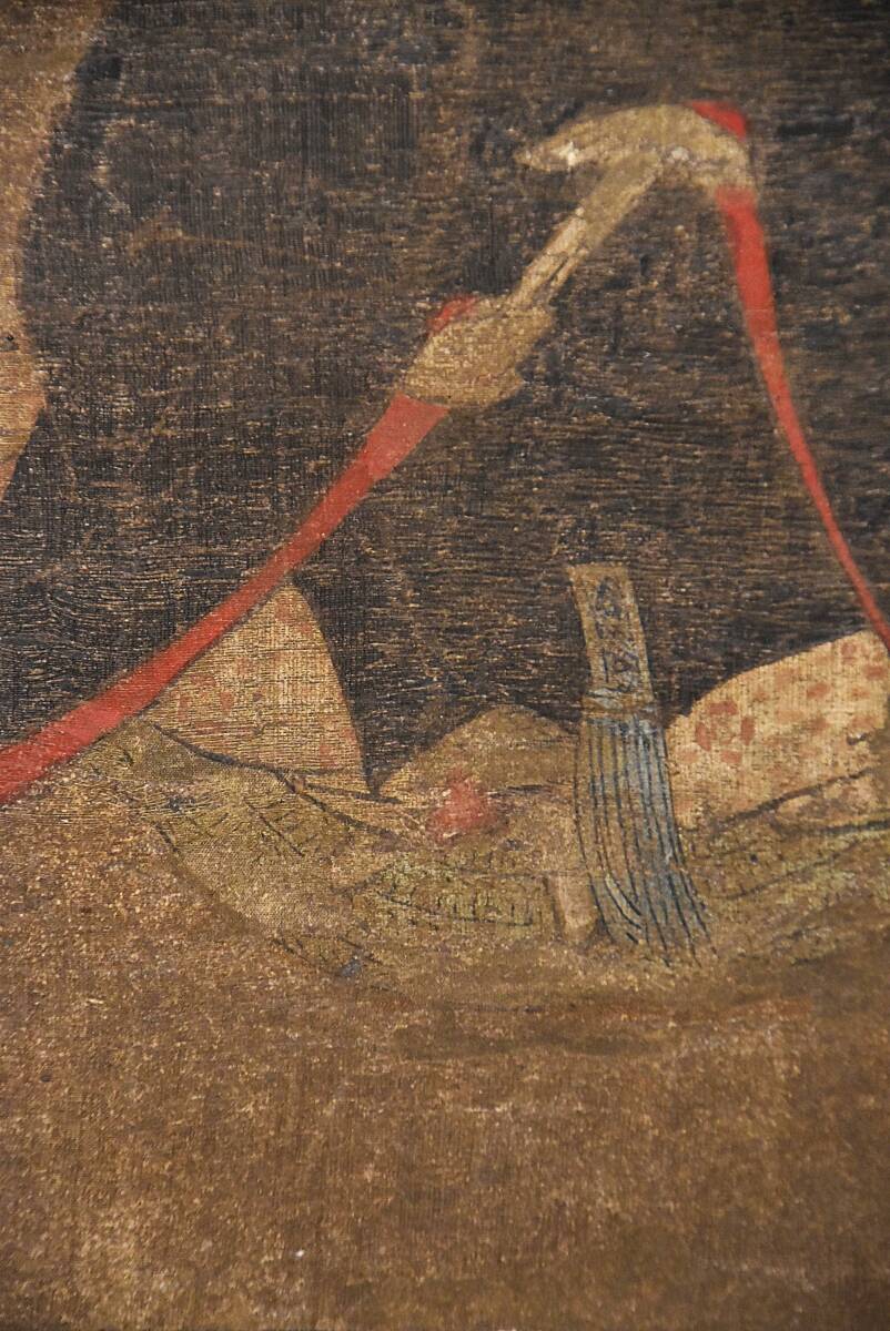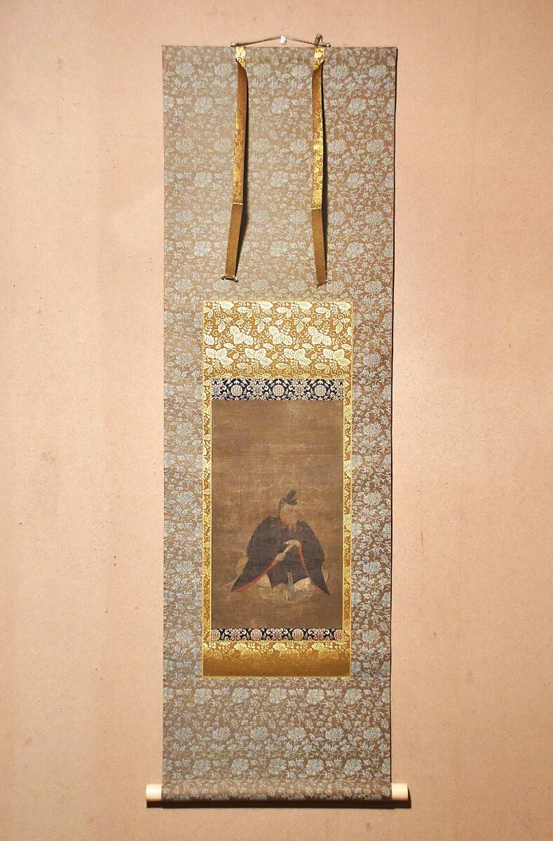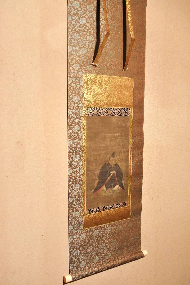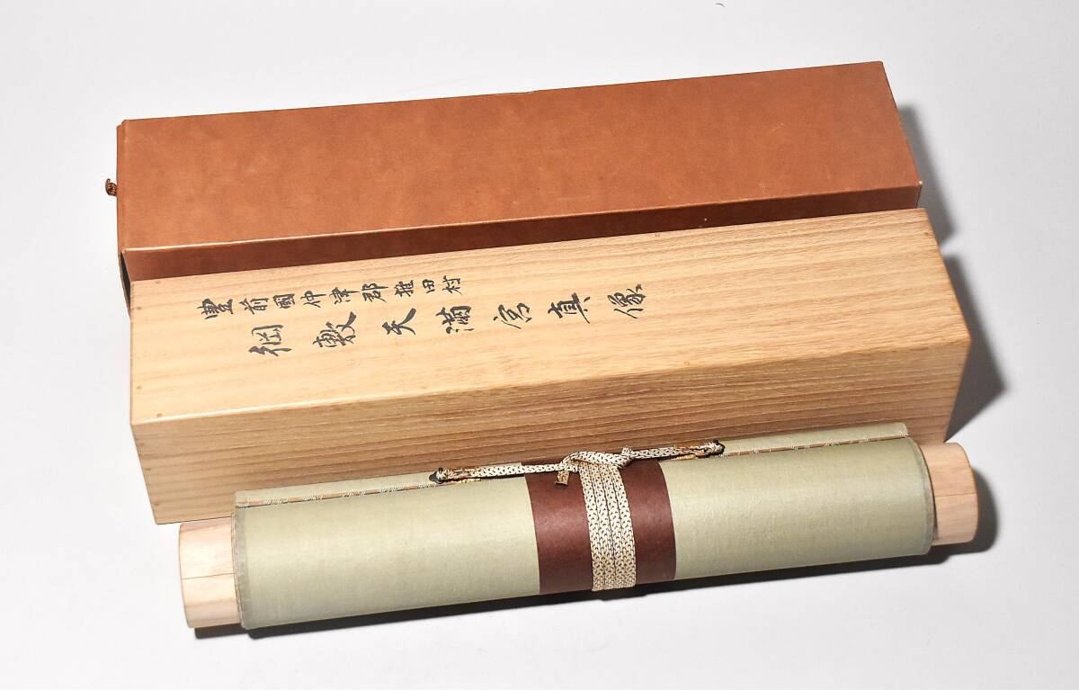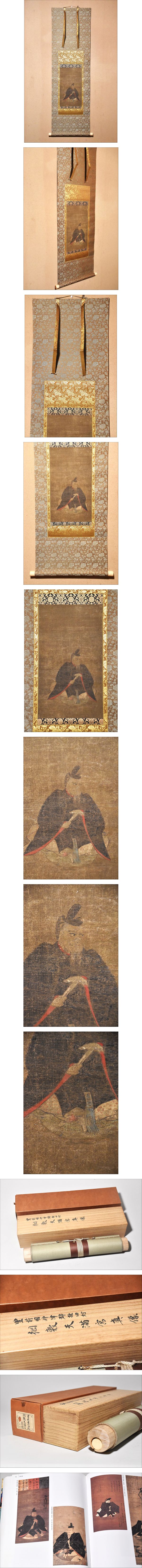| 商品説明 | 「綱敷天神像軸(南北朝~室町時代)」です。 太巻きで丁寧に仕立てられた箱表に 『豊前國仲津郡椎田村 綱敷天満宮真像』と書かれ 裏に『明治二十三年撤下 昭和五十三年改装』の記載があります。 “綱敷天神”の由来は、左遷され大宰府に赴く道真が 船綱を敷いて休息したとの由来によるものです。 “怒り天神像”本来の姿をとどめた作例とされていますが 古い時代の遺例は極端に少なく、室町まで遡ると思われる 本品は、小品ですが貴重です。 時代なりの損傷(彩色の剥落等のダメージ)はありますが 近年に丁寧に仕立てられた表装で、状態良く保たれており、 このままで保存鑑賞に耐えます。 どうか、よろしくお願いいたします。 参考写真:「天神さまの美術」に載る古例の“綱敷天神”