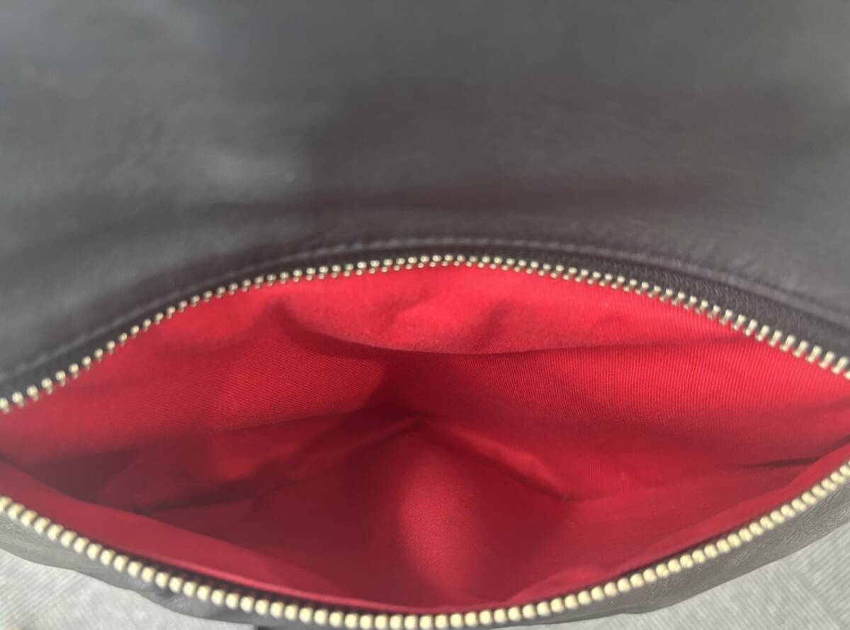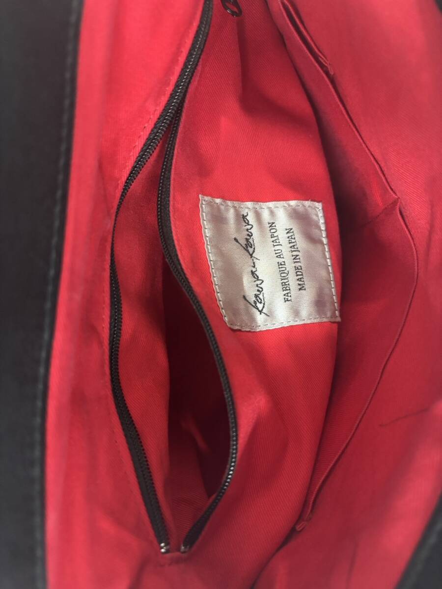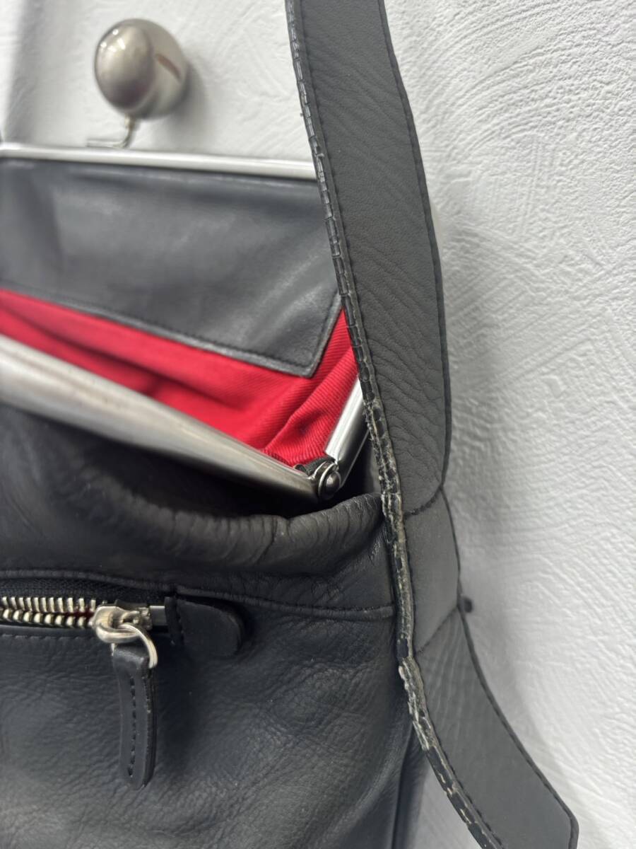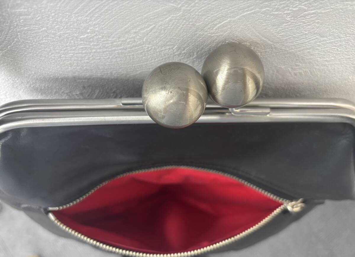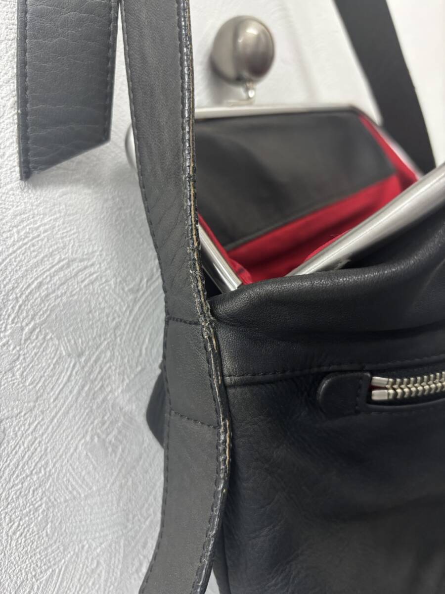 全体的に使用感あり、色落ちあり、手持ち部分剥げあり、がま口部分剥げあり