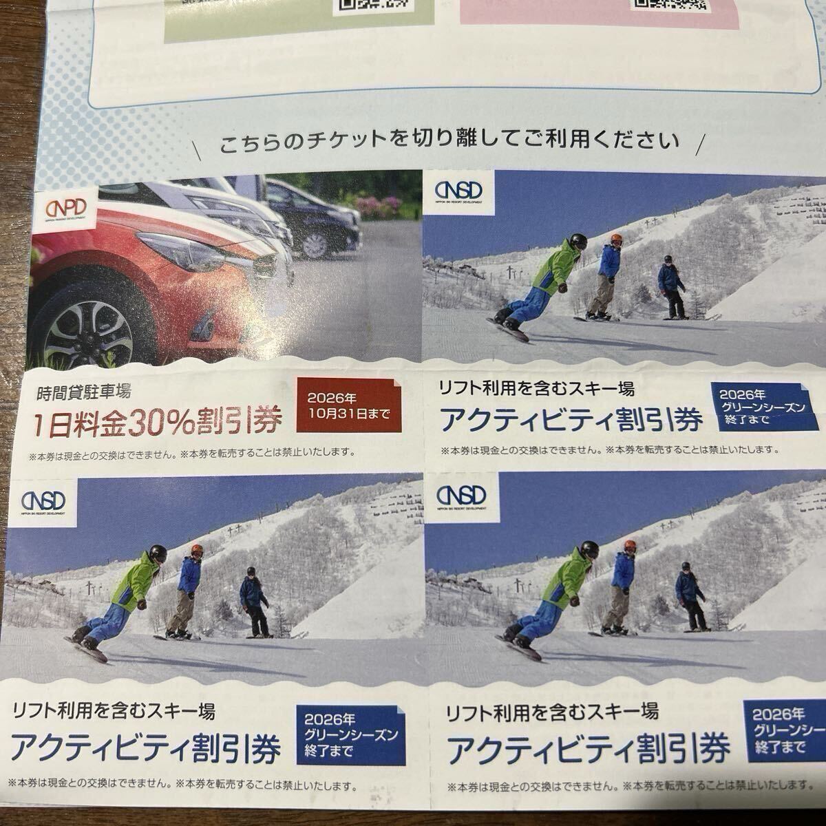 日本スキー場開発が運営するスキー場(白馬、菅平、栂池など)のアクティビティ割引券(3枚)などです。