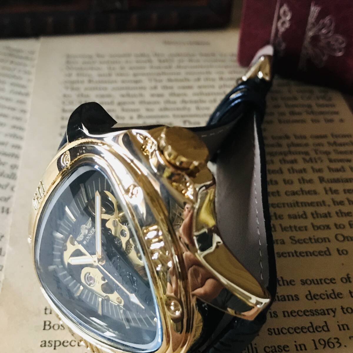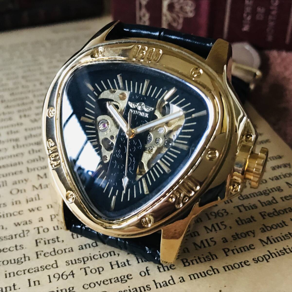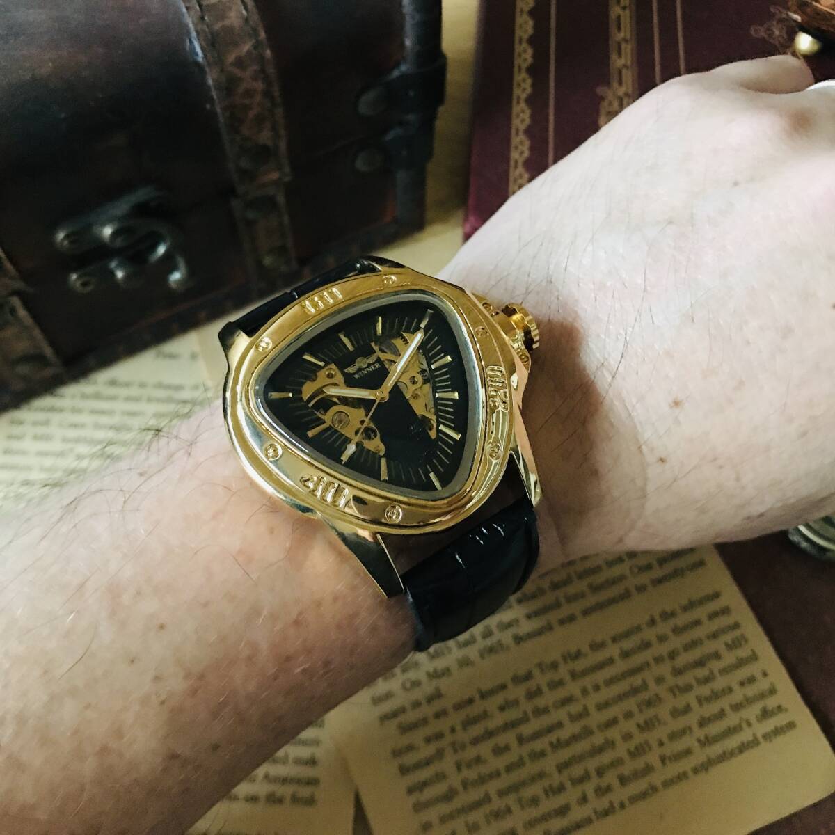 三角形のケースにオシャレな文字盤、ユニークな針が映える、とてもカッコイイ時計です。