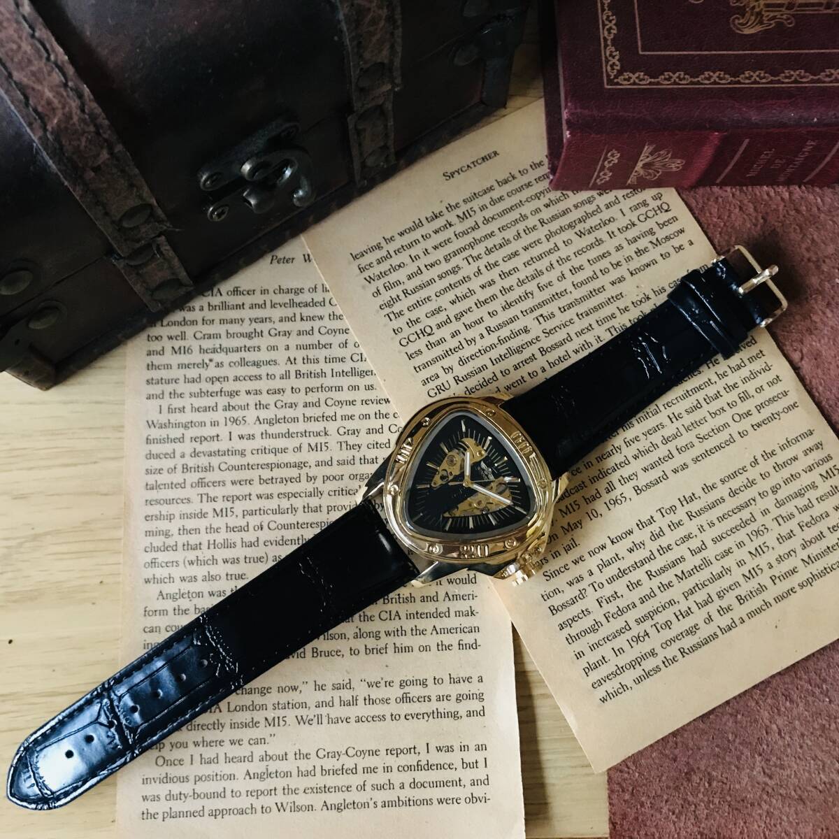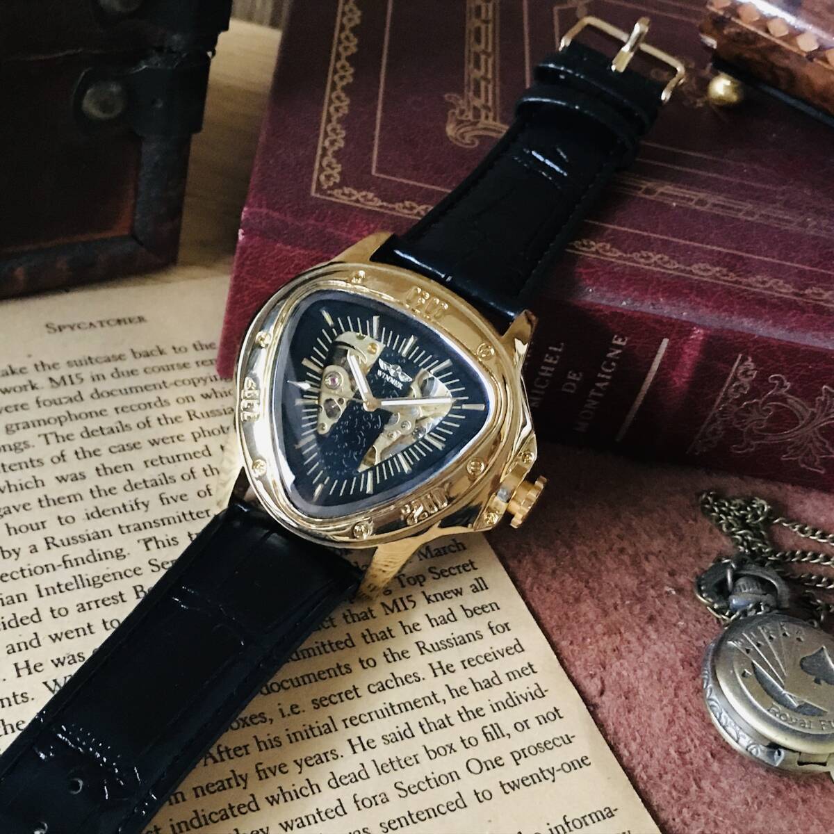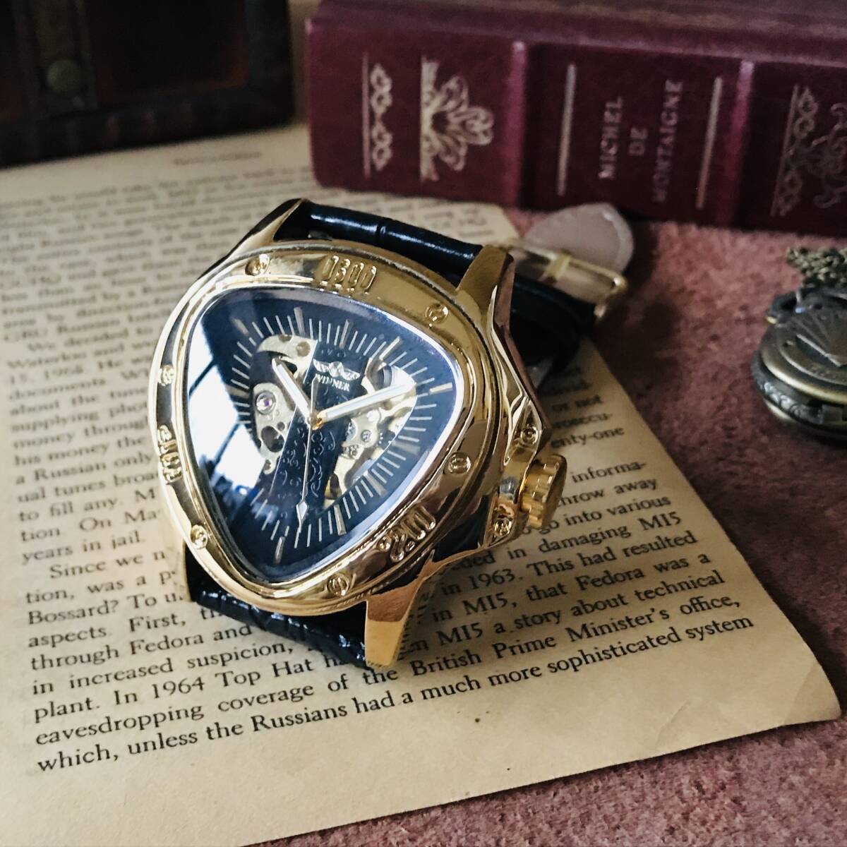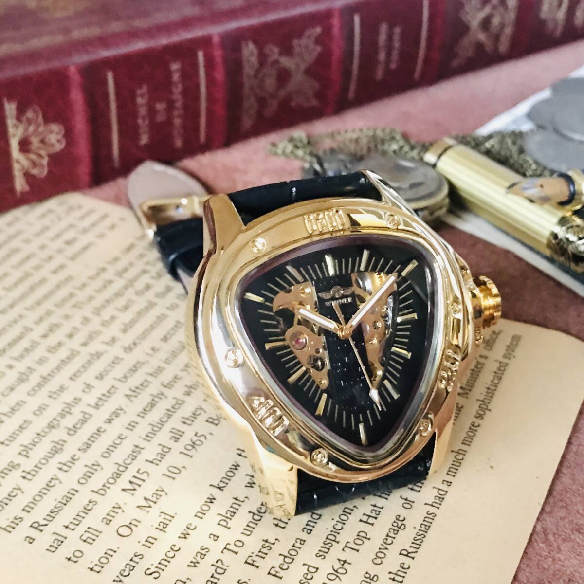 三角形のケースにオシャレな文字盤、ユニークな針が映える、とてもカッコイイ時計です。