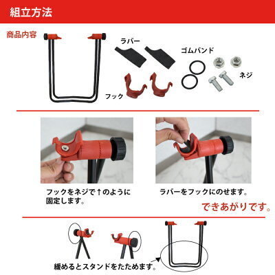 | ロードバイクやマウンテンバイク、クロスバイクなどに最適な自転車1台用スタンド スタンドを開いた状態で、上から車体を乗せるだけで取り付けできるチェーンステーで支えるタイプのメンテナンススタンドです。 室内展示、室内保管用にもご使用頂けます。 メンテナンスの邪魔にならず後輪を浮かせて安定して支えてくれますので 従来のクイックで支えるものより、装着が楽になります。 ・ゴムバンドで車体をとめれるので安定します。 ・クイックに挟むスタンドが苦手な方におすすめ。 ・組立も簡単で、使わないときは折りたたむ事可能です。 本体サイズ 材質:アルミ合金 対応:20インチから700Cまで カラー:ブラック、オレンジフック 付属品:フックx2、取付ネジ 《ご注意》 ・商品は入荷によりキズがある場合があります。 保証対象外になりますのでご了承お願い致します。 ・ディスプレイ環境により実物と色が異なる場合が有ります。 ・入荷時期により予告無く一部仕様変更する場合が有ります。 ・車種、サイズによって取付できない場合がございますので、形状やサイズなどををご確認の上ご購入下さい。 | |