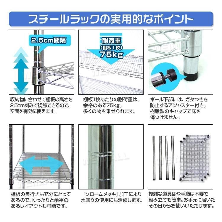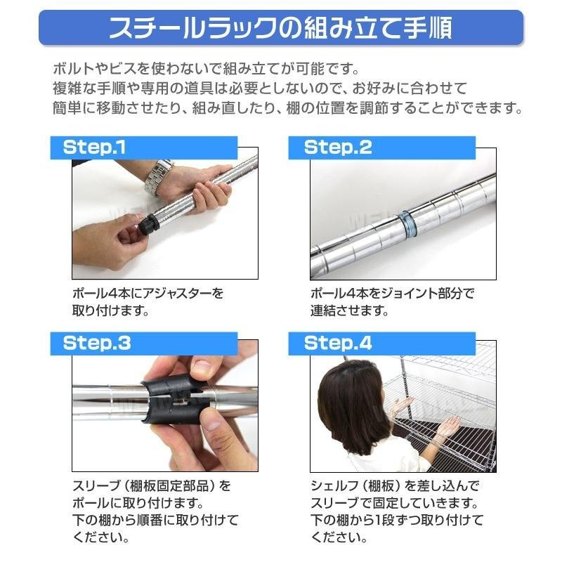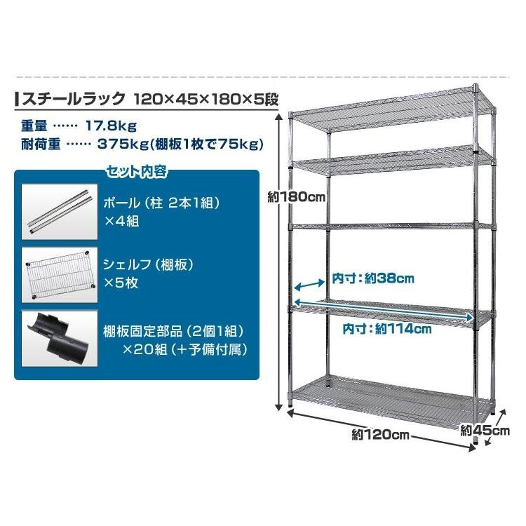 どんなお部屋にも合わせやすいスチールラックです。 ぐらつき防止アジャスター付き! クギやネジを使わずに簡単に組み立て出来ます! 棚の高さを自由に変えることができます。 一人暮らしのお部屋やリビング、キッチン、物置など場所を問わず活躍できます。 アパレルショップの店頭用やオフィスにも使用されています。 ●仕様 サイズ(約):幅120×奥行45×高さ180cm 耐荷重(約):(全体)375kg / (棚板1枚あたり)75kg 材質:スチール(クロームメッキ)、ABS樹脂他 重量(約):17.8kg ●セット内容 シェルフ(棚板) ×5 ポール(ジョイント式) ×4 棚板固定部品 ×20(+予備付属) 標準アジャスター(固定足) ×4 ■注意事項 ・海外製品で、簡易梱包での輸入のため風防に擦れや多少の小キズなどがある場合がございますが、商品自体には問題ありませんのでご了承下さい。 ・商品は、モニターによって色合いが異なって見える場合があります。 ・仕様・デザインは改良のため予告なく変更することがあります。 |