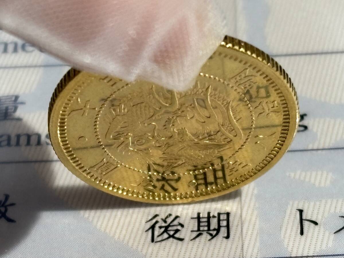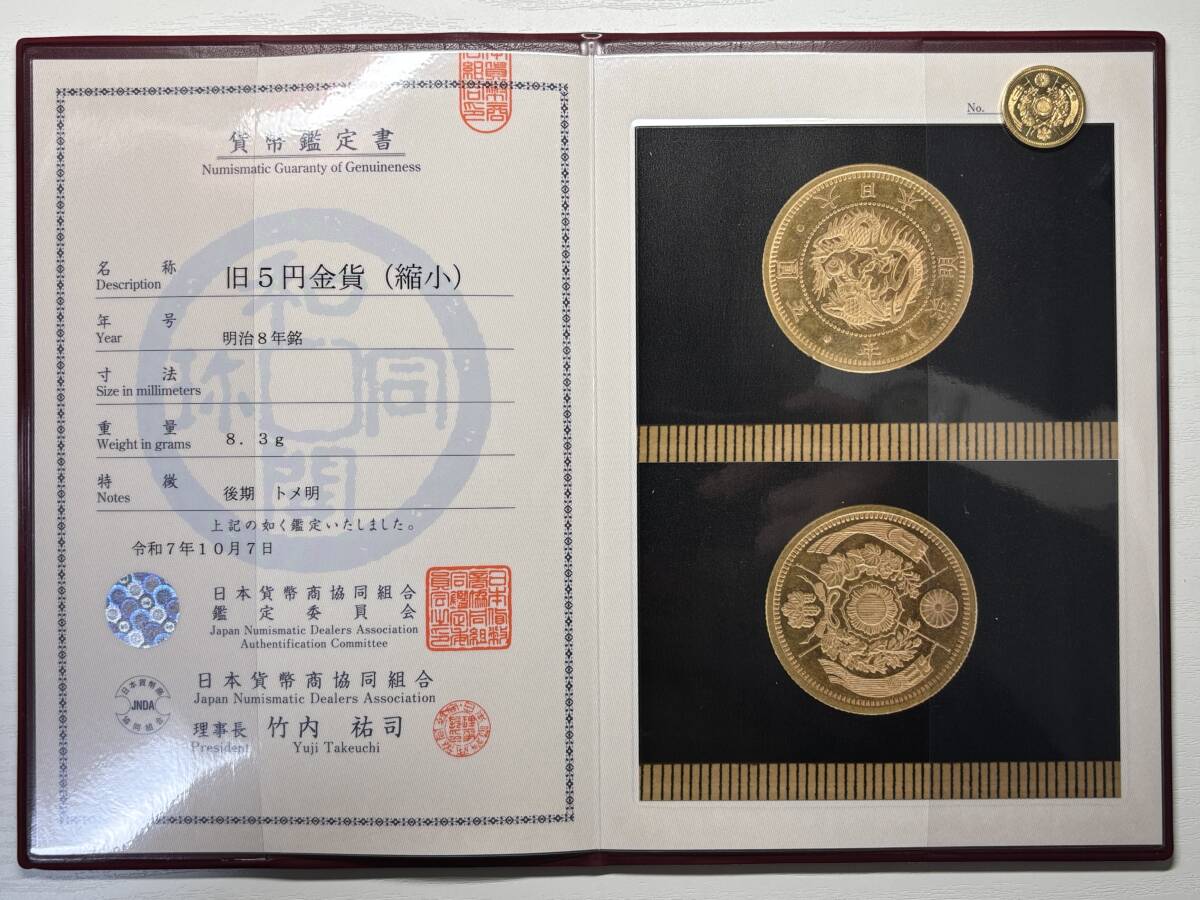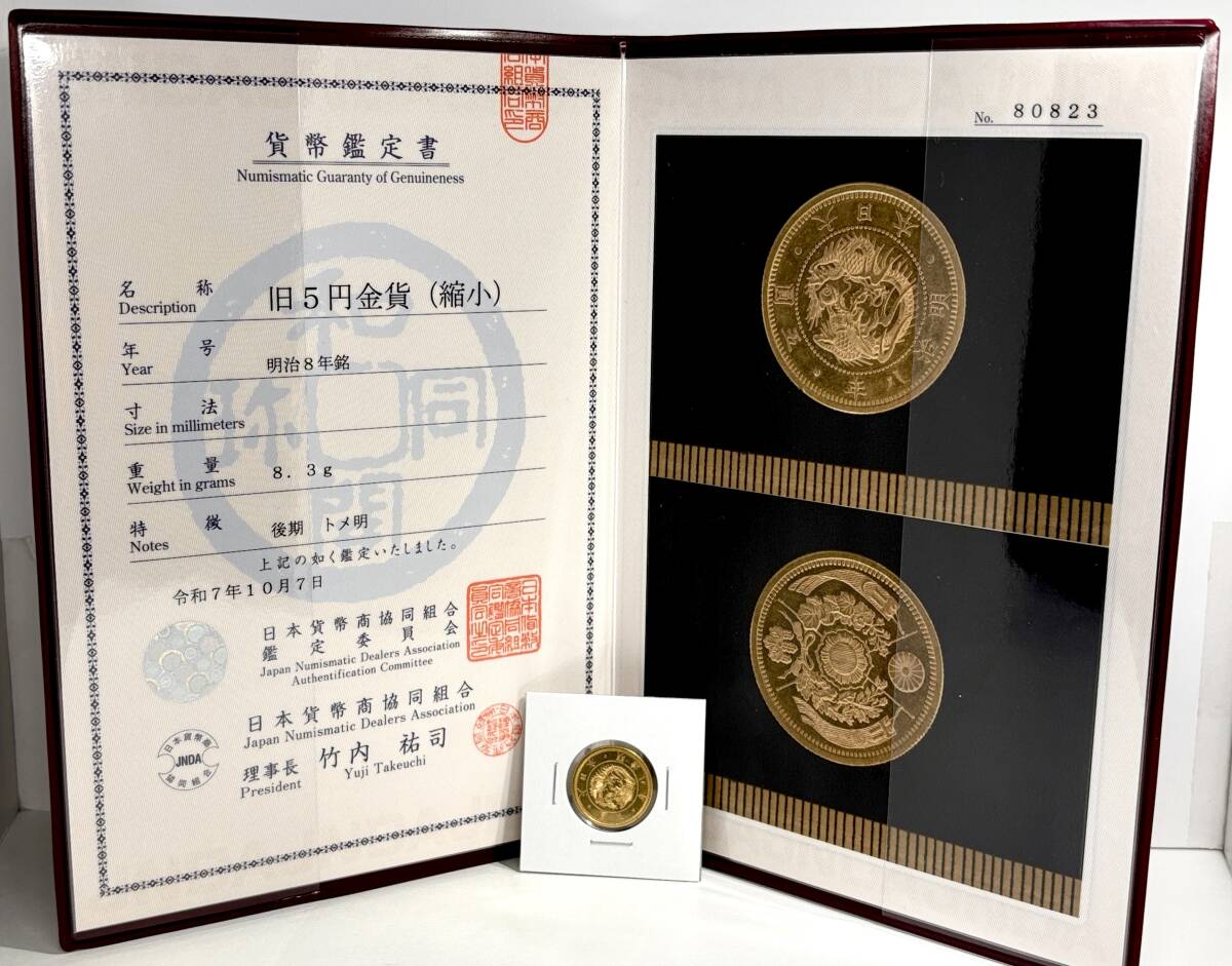 動画あり 明治8年 後期 旧5円金貨 縮小 日本貨幣商協同組合 鑑定書付き 1875年 特年 古銭 金貨 アンティーク 近代金貨 近代銭 旧五円金貨