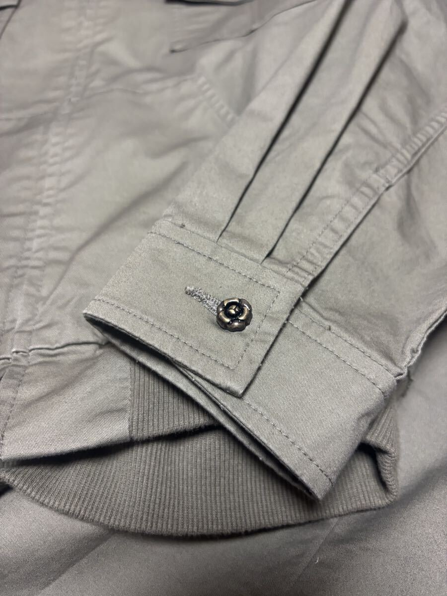 さりげない襟元のレースが女性らしさを感じるデザインです。チノパンの様なハリのある生地で、素敵です。