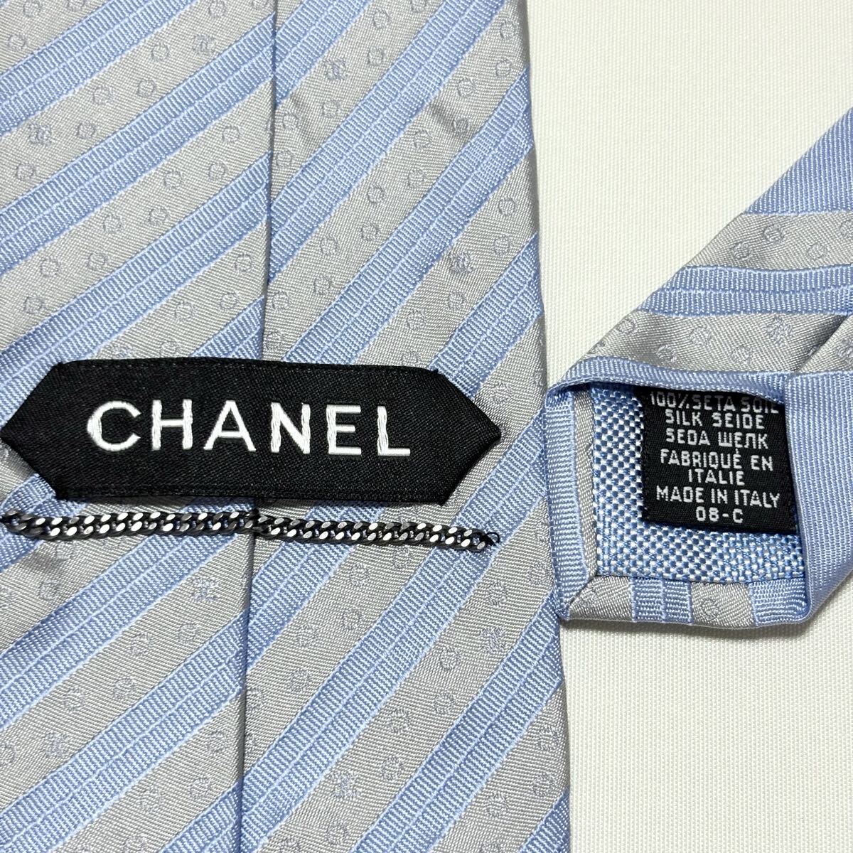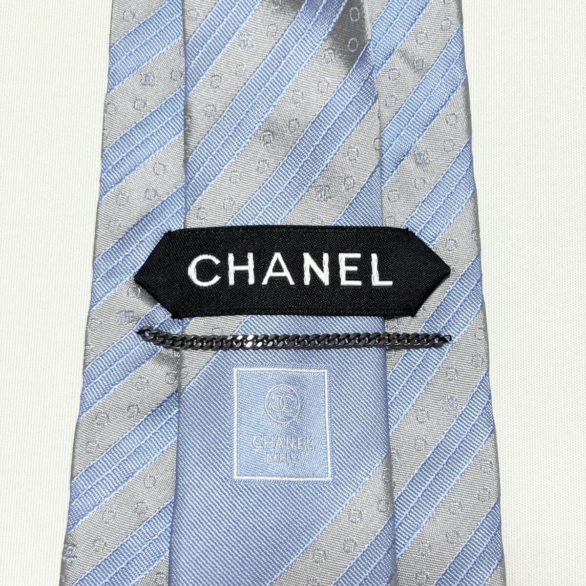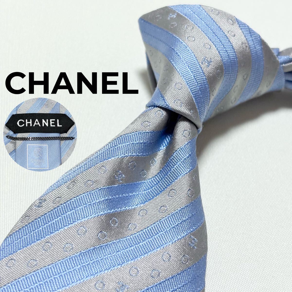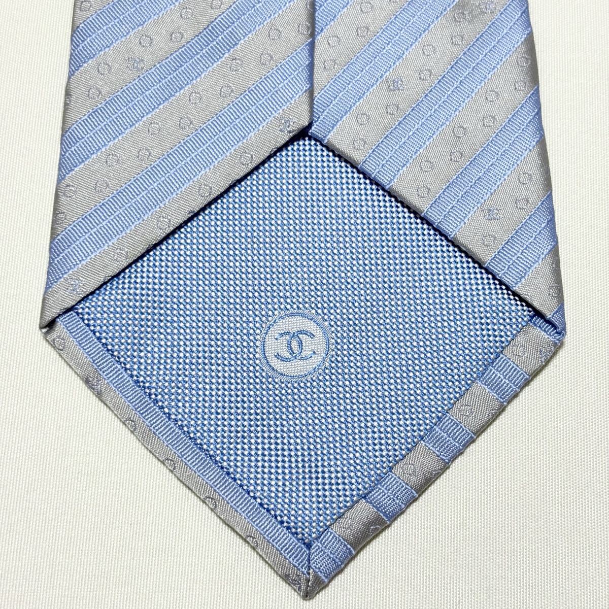 青とグレーのストライプにドット模様が施されたCHANELのフォーマルネクタイ。